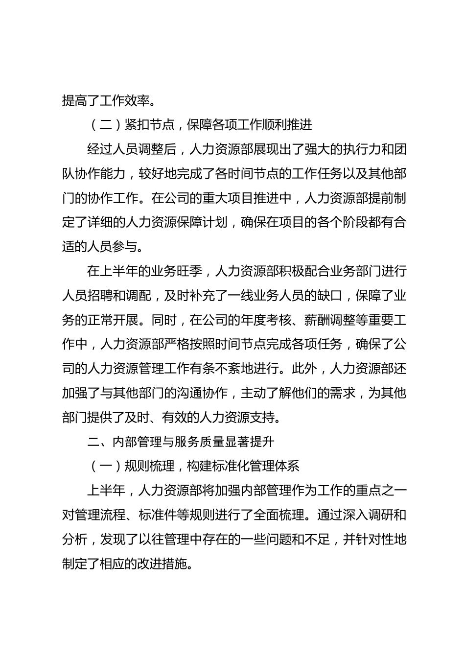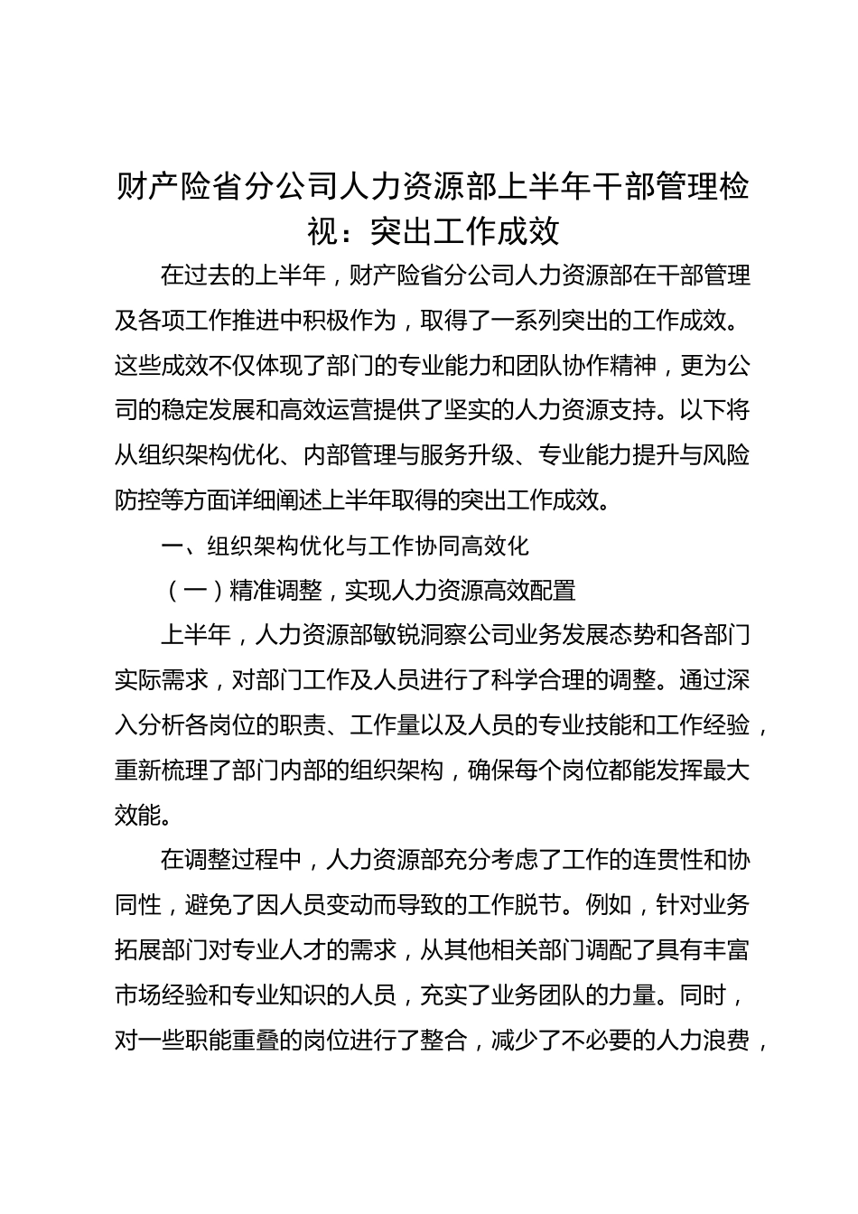 財(cái)產(chǎn)險(xiǎn)省分公司人力資源部上半年干部管理檢視:突出工作成效在過去的上半年,財(cái)產(chǎn)險(xiǎn)省分公司人力資源部在干部管理及各項(xiàng)工作推進(jìn)中積極作為,取得了一系列突出的工作成效。這些成效不僅體現(xiàn)了部門的專業(yè)能力和團(tuán)隊(duì)協(xié)作精神,更為公司的穩(wěn)定發(fā)展和高效運(yùn)營(yíng)提供了堅(jiān)實(shí)的人力資源支持。以下將從組織架構(gòu)優(yōu)化、內(nèi)部管理與服務(wù)升級(jí)、專業(yè)能力提升與風(fēng)險(xiǎn)防控等方面詳細(xì)闡述上半年取得的突出工作成效。一、組織架構(gòu)優(yōu)化與工作協(xié)同高效化(一)精準(zhǔn)調(diào)整,實(shí)現(xiàn)人力資源高效配置上半年,人力資源部敏銳洞察公司業(yè)務(wù)發(fā)展態(tài)勢(shì)和各部門實(shí)際需求,對(duì)部門工作及人員進(jìn)行了科學(xué)合理的調(diào)整...