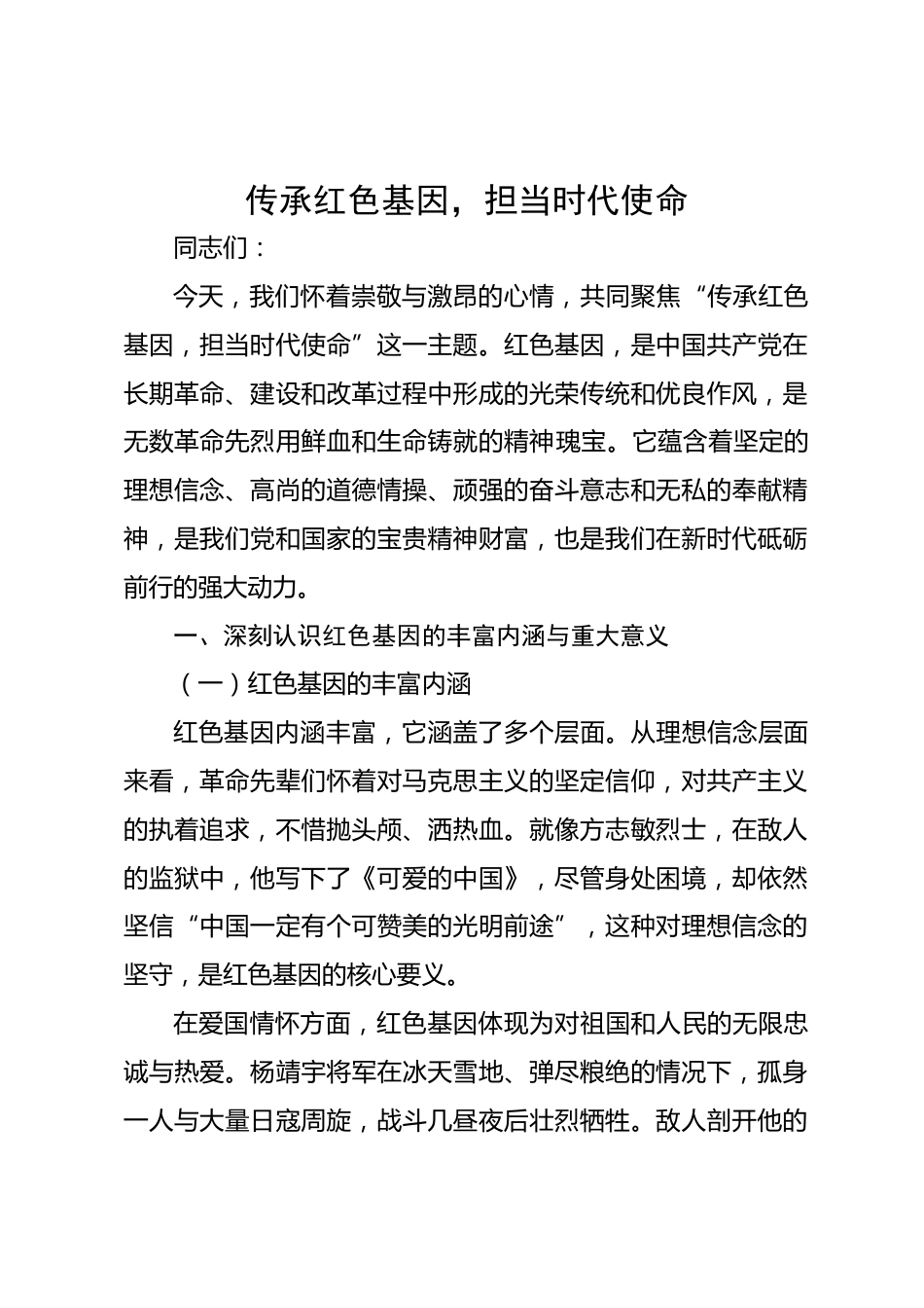 傳承紅色基因,擔當時代使命同志們:今天,我們懷著崇敬與激昂的心情,共同聚焦“傳承紅色基因,擔當時代使命”這一主題。紅色基因,是中國共產黨在長期革命、建設和改革過程中形成的光榮傳統(tǒng)和優(yōu)良作風,是無數革命先烈用鮮血和生命鑄就的精神瑰寶。它蘊含著堅定的理想信念、高尚的道德情操、頑強的奮斗意志和無私的奉獻精神,是我們黨和國家的寶貴精神財富,也是我們在新時代砥礪前行的強大動力。一、深刻認識紅色基因的豐富內涵與重大意義(一)紅色基因的豐富內涵紅色基因內涵豐富,它涵蓋了多個層面。從理想信念層面來看,革命先輩們懷著對馬克思主義的堅定信仰,對...