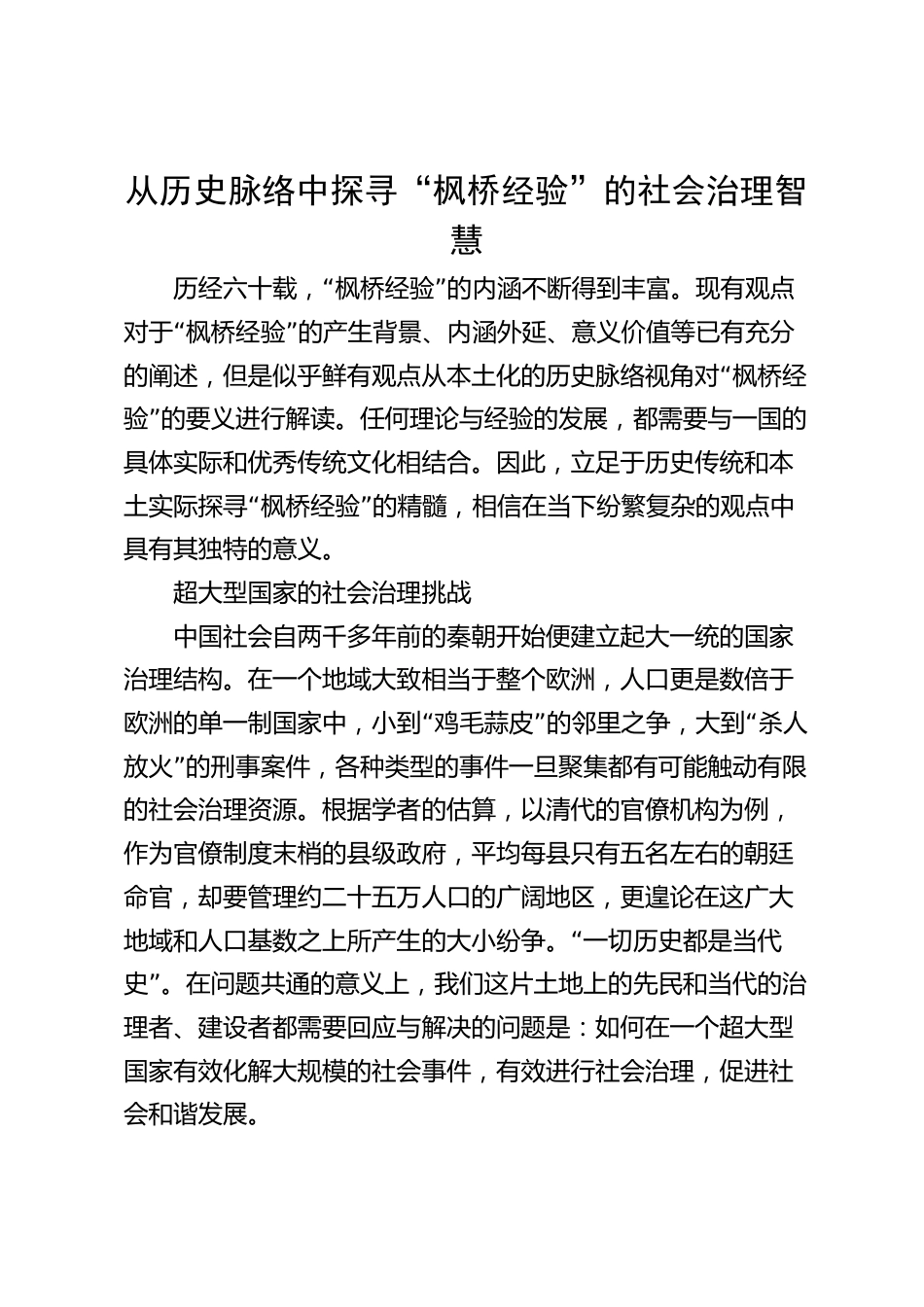 從歷史脈絡(luò)中探尋“楓橋經(jīng)驗(yàn)”的社會(huì)治理智慧“”歷經(jīng)六十載,楓橋經(jīng)驗(yàn)的內(nèi)涵不斷得到豐富?,F(xiàn)有觀點(diǎn)“”對(duì)于楓橋經(jīng)驗(yàn)的產(chǎn)生背景、內(nèi)涵外延、意義價(jià)值等已有充分“的闡述,但是似乎鮮有觀點(diǎn)從本土化的歷史脈絡(luò)視角對(duì)楓橋經(jīng)”驗(yàn)的要義進(jìn)行解讀。任何理論與經(jīng)驗(yàn)的發(fā)展,都需要與一國的具體實(shí)際和優(yōu)秀傳統(tǒng)文化相結(jié)合。因此,立足于歷史傳統(tǒng)和本“”土實(shí)際探尋楓橋經(jīng)驗(yàn)的精髓,相信在當(dāng)下紛繁復(fù)雜的觀點(diǎn)中具有其獨(dú)特的意義。超大型國家的社會(huì)治理挑戰(zhàn)中國社會(huì)自兩千多年前的秦朝開始便建立起大一統(tǒng)的國家治理結(jié)構(gòu)。在一個(gè)地域大致相當(dāng)于整個(gè)歐洲,人口更是數(shù)倍于“”“歐洲的...