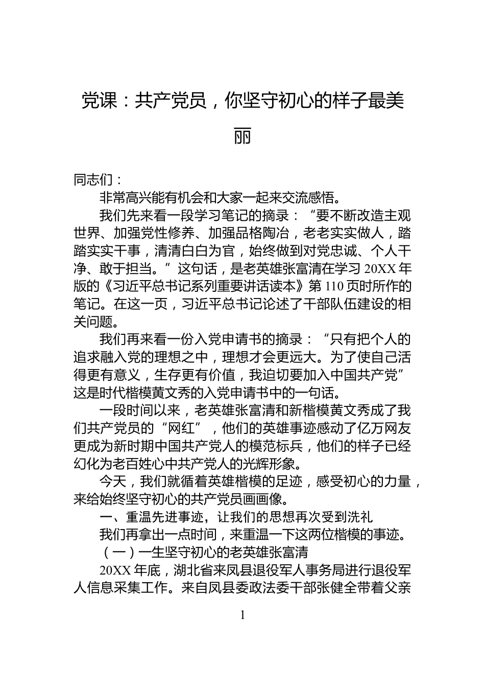 黨課:共產(chǎn)黨員,你堅守初心的樣子最美麗同志們:非常高興能有機(jī)會和大家一起來交流感悟。我們先來看一段學(xué)習(xí)筆記的摘錄:“要不斷改造主觀世界、加強(qiáng)黨性修養(yǎng)、加強(qiáng)品格陶冶,老老實實做人,踏踏實實干事,清清白白為官,始終做到對黨忠誠、個人干凈、敢于擔(dān)當(dāng)?!边@句話,是老英雄張富清在學(xué)習(xí)20XX年版的《習(xí)近平總書記系列重要講話讀本》第110頁時所作的筆記。在這一頁,習(xí)近平總書記論述了干部隊伍建設(shè)的相關(guān)問題。我們再來看一份入黨申請書的摘錄:“只有把個人的追求融入黨的理想之中,理想才會更遠(yuǎn)大。為了使自己活得更有意義,生存更有價值,我迫切要加入中國共...