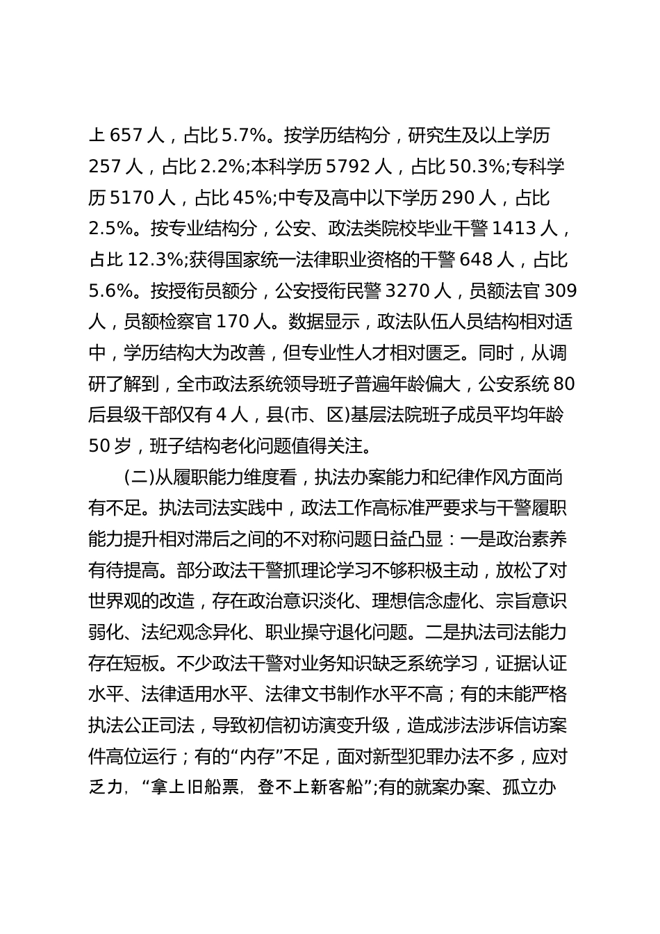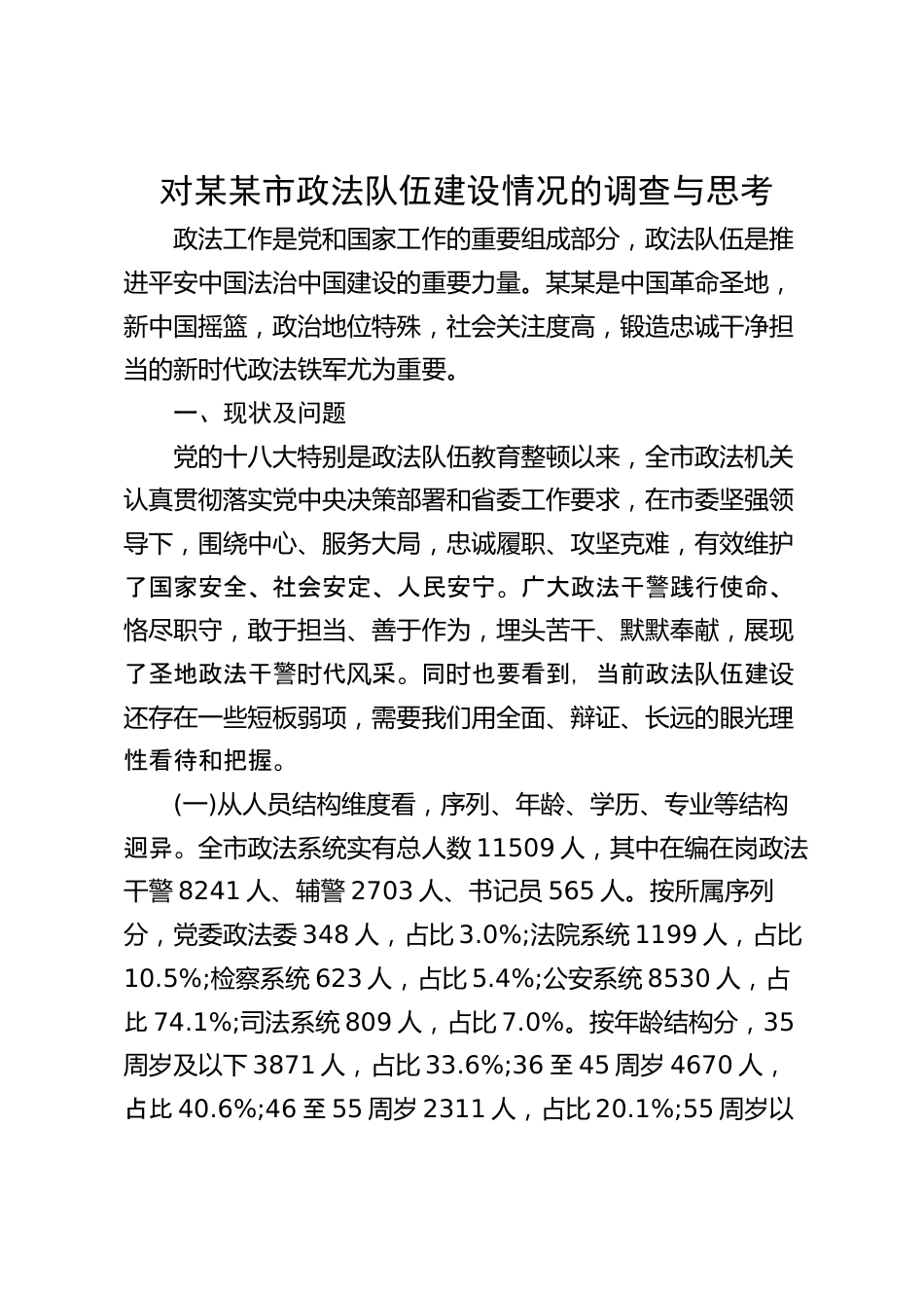 對某某市政法隊(duì)伍建設(shè)情況的調(diào)查與思考政法工作是黨和國家工作的重要組成部分,政法隊(duì)伍是推進(jìn)平安中國法治中國建設(shè)的重要力量。某某是中國革命圣地,新中國搖籃,政治地位特殊,社會關(guān)注度高,鍛造忠誠干凈擔(dān)當(dāng)?shù)男聲r代政法鐵軍尤為重要。一、現(xiàn)狀及問題黨的十八大特別是政法隊(duì)伍教育整頓以來,全市政法機(jī)關(guān)認(rèn)真貫徹落實(shí)黨中央決策部署和省委工作要求,在市委堅(jiān)強(qiáng)領(lǐng)導(dǎo)下,圍繞中心、服務(wù)大局,忠誠履職、攻堅(jiān)克難,有效維護(hù)了國家安全、社會安定、人民安寧。廣大政法干警踐行使命、恪盡職守,敢于擔(dān)當(dāng)、善于作為,埋頭苦干、默默奉獻(xiàn),展現(xiàn)了圣地政法干警代采。同也要看...