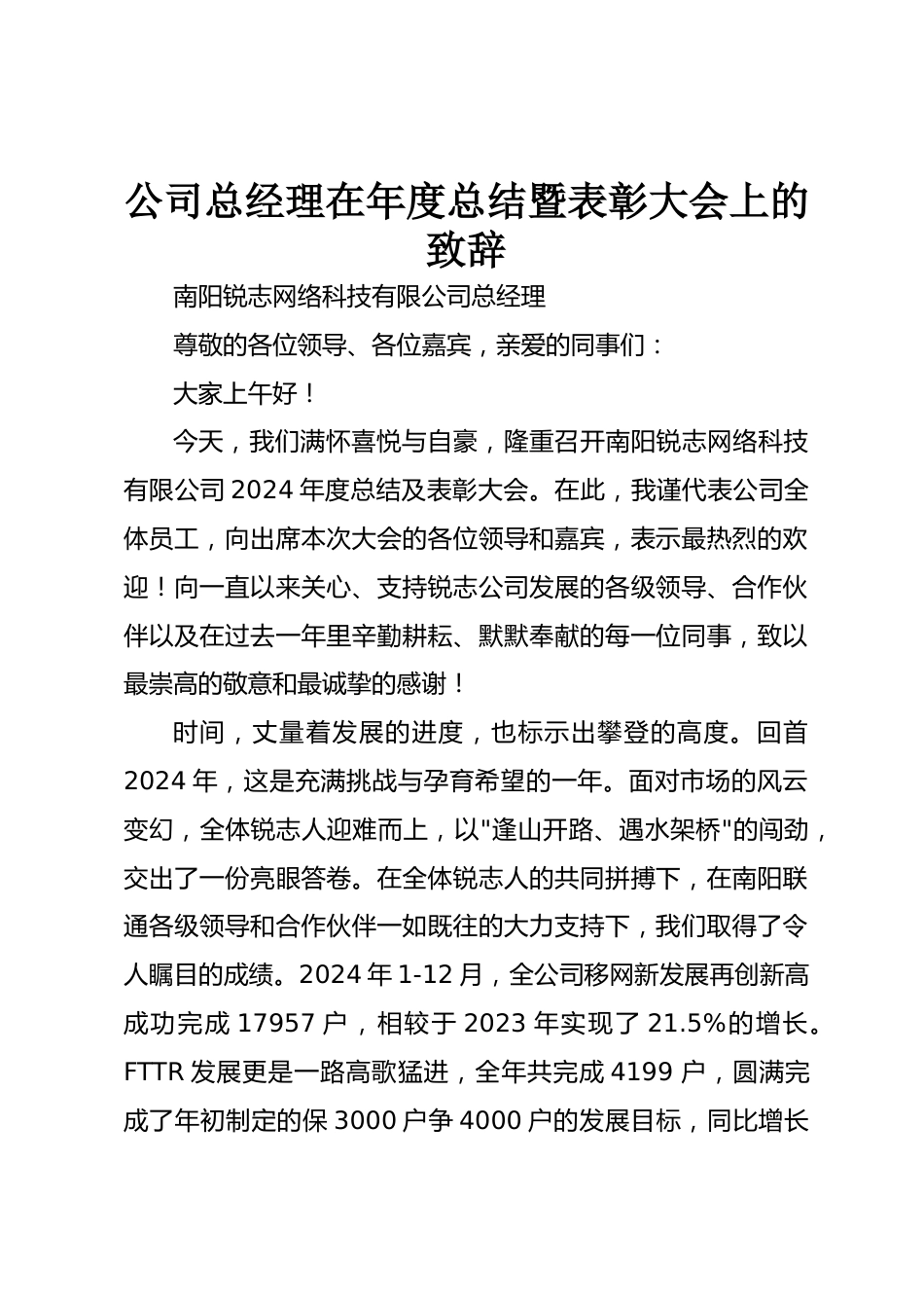 公司總經(jīng)理在年度總結(jié)暨表彰大會(huì)上的致辭南陽銳志網(wǎng)絡(luò)科技有限公司總經(jīng)理尊敬的各位領(lǐng)導(dǎo)、各位嘉賓,親愛的同事們:大家上午好!今天,我們滿懷喜悅與自豪,隆重召開南陽銳志網(wǎng)絡(luò)科技有限公司2024年度總結(jié)及表彰大會(huì)。在此,我謹(jǐn)代表公司全體員工,向出席本次大會(huì)的各位領(lǐng)導(dǎo)和嘉賓,表示最熱烈的歡迎!向一直以來關(guān)心、支持銳志公司發(fā)展的各級領(lǐng)導(dǎo)、合作伙伴以及在過去一年里辛勤耕耘、默默奉獻(xiàn)的每一位同事,致以最崇高的敬意和最誠摯的感謝!時(shí)間,丈量著發(fā)展的進(jìn)度,也標(biāo)示出攀登的高度。回首2024年,這是充滿挑戰(zhàn)與孕育希望的一年。面對市場的風(fēng)云變幻,全體銳志人迎...