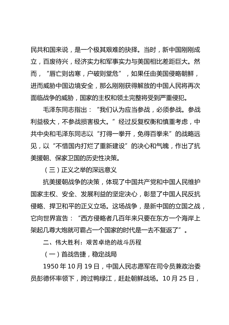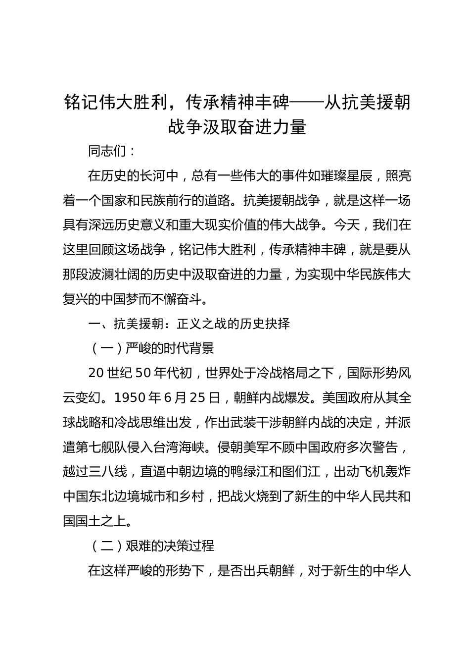 銘記偉大勝利,傳承精神豐碑——從抗美援朝戰(zhàn)爭(zhēng)汲取奮進(jìn)力量同志們:在歷史的長(zhǎng)河中,總有一些偉大的事件如璀璨星辰,照亮著一個(gè)國(guó)家和民族前行的道路。抗美援朝戰(zhàn)爭(zhēng),就是這樣一場(chǎng)具有深遠(yuǎn)歷史意義和重大現(xiàn)實(shí)價(jià)值的偉大戰(zhàn)爭(zhēng)。今天,我們?cè)谶@里回顧這場(chǎng)戰(zhàn)爭(zhēng),銘記偉大勝利,傳承精神豐碑,就是要從那段波瀾壯闊的歷史中汲取奮進(jìn)的力量,為實(shí)現(xiàn)中華民族偉大復(fù)興的中國(guó)夢(mèng)而不懈奮斗。一、抗美援朝:正義之戰(zhàn)的歷史抉擇(一)嚴(yán)峻的時(shí)代背景20世紀(jì)50年代初,世界處于冷戰(zhàn)格局之下,國(guó)際形勢(shì)風(fēng)云變幻。1950年6月25日,朝鮮內(nèi)戰(zhàn)爆發(fā)。美國(guó)政府從其全球戰(zhàn)略和冷戰(zhàn)思維出發(fā),作...
