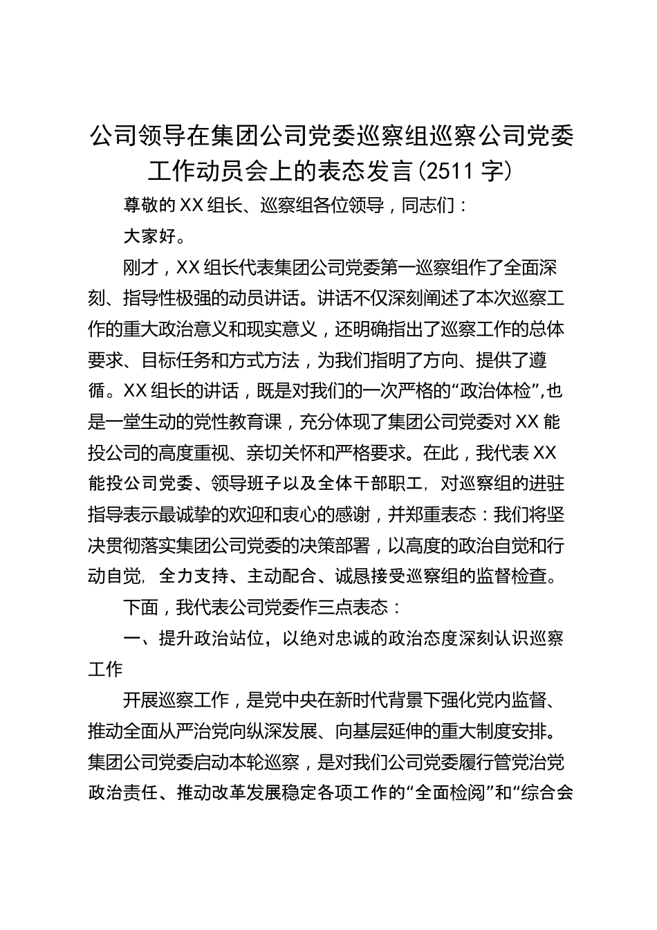 國企黨委巡察組巡察公司黨委工作動員會上的表態(tài)發(fā)言(2511字)VIP免費