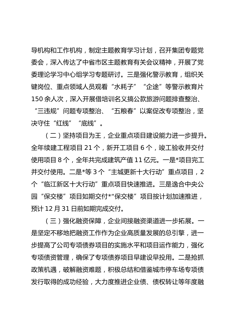 國(guó)企集團(tuán)2024年工作總結(jié)暨2025年工作計(jì)劃2024年,是集團(tuán)公司貫徹落實(shí)黨的二十大精神的開局之年,也是集團(tuán)公司堅(jiān)持“雙模并舉、雙輪驅(qū)動(dòng)、雙化引領(lǐng)”,圍繞區(qū)委區(qū)政府“1353”發(fā)展戰(zhàn)略和“主城更新十大行動(dòng)”重點(diǎn)項(xiàng)目攻堅(jiān)破難、勇挑重?fù)?dān)的關(guān)鍵之年。一年來,在區(qū)委區(qū)政府的堅(jiān)強(qiáng)領(lǐng)導(dǎo)下,在區(qū)財(cái)政局和區(qū)國(guó)資國(guó)企服務(wù)中心的精心指導(dǎo)下,集團(tuán)公司圍繞“雙二零+”發(fā)展戰(zhàn)略和“一利五率”總要求,堅(jiān)持“穩(wěn)字當(dāng)頭、穩(wěn)中求進(jìn)”工作總基調(diào),一手抓省市重點(diǎn)項(xiàng)目、“保交樓”項(xiàng)目、政策性基金項(xiàng)目統(tǒng)籌推進(jìn),一手抓區(qū)屬國(guó)有企業(yè)戰(zhàn)略重組和業(yè)務(wù)劃轉(zhuǎn)改革,圓滿完成了年度各項(xiàng)工作目標(biāo)。...