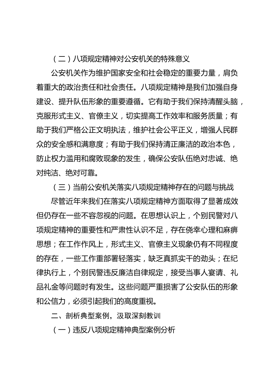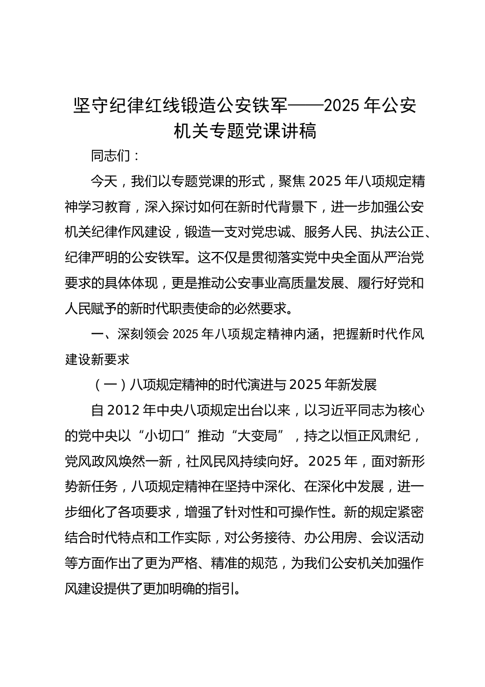 堅守紀律紅線鍛造公安鐵軍——2025年公安機關(guān)專題黨課講稿同志們:今天,我們以專題黨課的形式,聚焦2025年八項規(guī)定精神學(xué)習(xí)教育,深入探討如何在新時代背景下,進一步加強公安機關(guān)紀律作風(fēng)建設(shè),鍛造一支對黨忠誠、服務(wù)人民、執(zhí)法公正、紀律嚴明的公安鐵軍。這不僅是貫徹落實黨中央全面從嚴治黨要求的具體體現(xiàn),更是推動公安事業(yè)高質(zhì)量發(fā)展、履行好黨和人民賦予的新時代職責(zé)使命的必然要求。一、深刻領(lǐng)會2025年八項規(guī)定精神內(nèi)涵,把握新時代作風(fēng)建設(shè)新要求(一)八項規(guī)定精神的時代演進與2025年新發(fā)展自2012年中央八項規(guī)定出臺以來,以習(xí)近平同志為核心的黨中央以“小切...