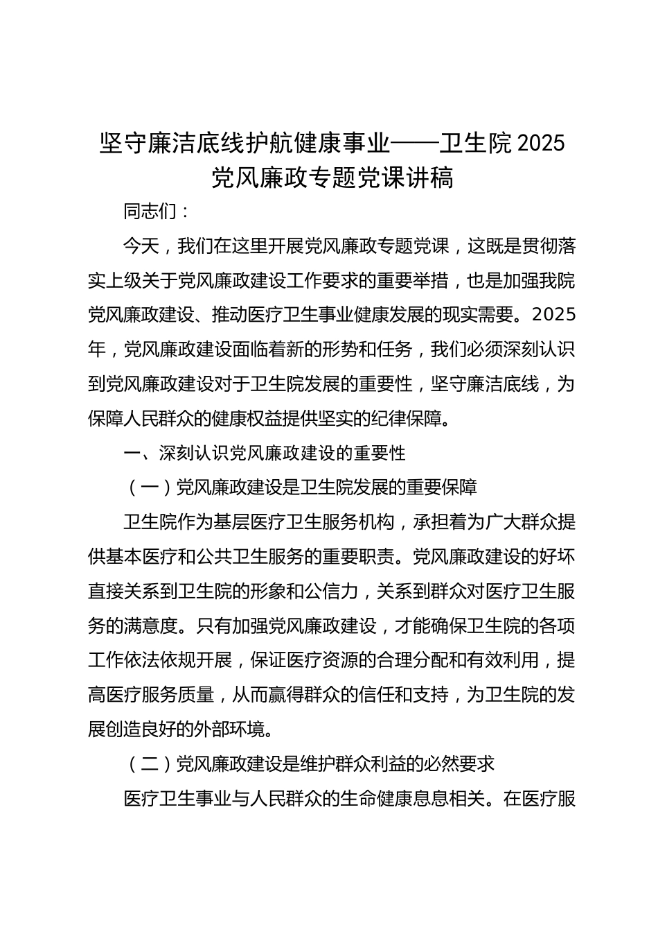 堅守廉潔底線護航健康事業(yè)——衛(wèi)生院2025黨風(fēng)廉政專題黨課講稿同志們:今天,我們在這里開展黨風(fēng)廉政專題黨課,這既是貫徹落實上級關(guān)于黨風(fēng)廉政建設(shè)工作要求的重要舉措,也是加強我院黨風(fēng)廉政建設(shè)、推動醫(yī)療衛(wèi)生事業(yè)健康發(fā)展的現(xiàn)實需要。2025年,黨風(fēng)廉政建設(shè)面臨著新的形勢和任務(wù),我們必須深刻認(rèn)識到黨風(fēng)廉政建設(shè)對于衛(wèi)生院發(fā)展的重要性,堅守廉潔底線,為保障人民群眾的健康權(quán)益提供堅實的紀(jì)律保障。一、深刻認(rèn)識黨風(fēng)廉政建設(shè)的重要性(一)黨風(fēng)廉政建設(shè)是衛(wèi)生院發(fā)展的重要保障衛(wèi)生院作為基層醫(yī)療衛(wèi)生服務(wù)機構(gòu),承擔(dān)著為廣大群眾提供基本醫(yī)療和公共衛(wèi)生服務(wù)的重要職責(zé)...