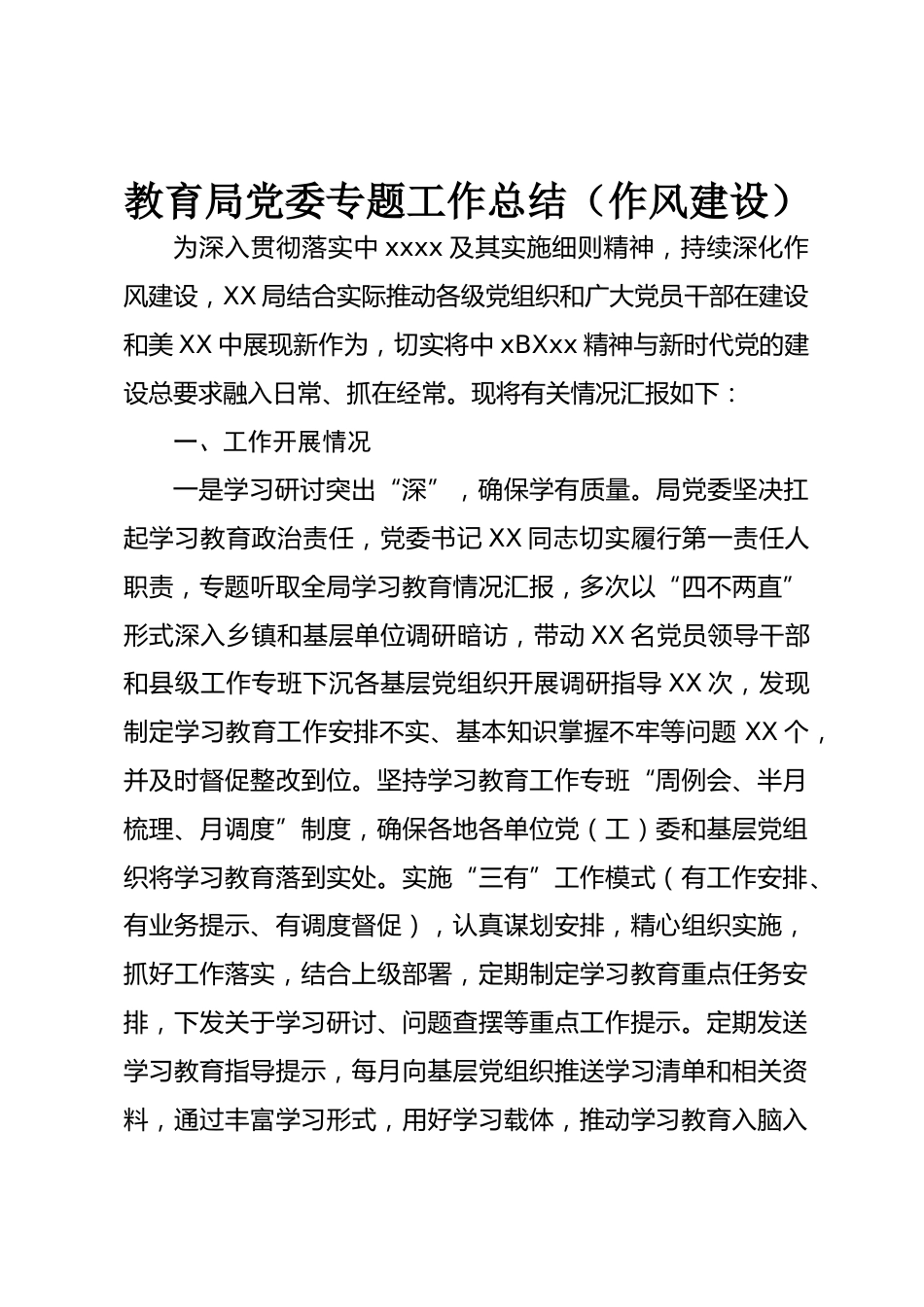 教育局黨委專題工作總結(jié)(作風建設(shè))為深入貫徹落實中xxxx及其實施細則精神,持續(xù)深化作風建設(shè),XX局結(jié)合實際推動各級黨組織和廣大黨員干部在建設(shè)和美XX中展現(xiàn)新作為,切實將中xBXxx精神與新時代黨的建設(shè)總要求融入日常、抓在經(jīng)?!,F(xiàn)將有關(guān)情況匯報如下:一、工作開展情況一是學(xué)習研討突出“深”,確保學(xué)有質(zhì)量。局黨委堅決扛起學(xué)習教育政治責任,黨委書記XX同志切實履行第一責任人職責,專題聽取全局學(xué)習教育情況匯報,多次以“四不兩直”形式深入鄉(xiāng)鎮(zhèn)和基層單位調(diào)研暗訪,帶動XX名黨員領(lǐng)導(dǎo)干部和縣級工作專班下沉各基層黨組織開展調(diào)研指導(dǎo)XX次,發(fā)現(xiàn)制定學(xué)習教育工作...