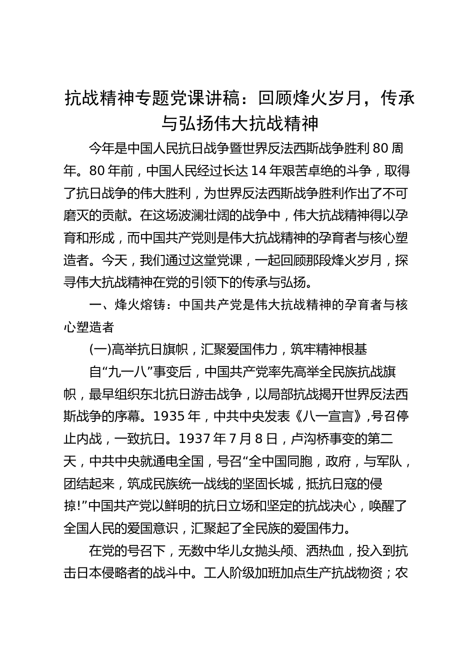 抗戰(zhàn)精神專題黨課講稿:回顧烽火歲月,傳承與弘揚(yáng)偉大抗戰(zhàn)精神今年是中國人民抗日戰(zhàn)爭暨世界反法西斯戰(zhàn)爭勝利80周年。80年前,中國人民經(jīng)過長達(dá)14年艱苦卓絕的斗爭,取得了抗日戰(zhàn)爭的偉大勝利,為世界反法西斯戰(zhàn)爭勝利作出了不可磨滅的貢獻(xiàn)。在這場波瀾壯闊的戰(zhàn)爭中,偉大抗戰(zhàn)精神得以孕育和形成,而中國共產(chǎn)黨則是偉大抗戰(zhàn)精神的孕育者與核心塑造者。今天,我們通過這堂黨課,一起回顧那段烽火歲月,探尋偉大抗戰(zhàn)精神在黨的引領(lǐng)下的傳承與弘揚(yáng)。一、烽火熔鑄:中國共產(chǎn)黨是偉大抗戰(zhàn)精神的孕育者與核心塑造者(一)高舉抗日旗幟,匯聚愛國偉力,筑牢精神根基“”自九一八事...