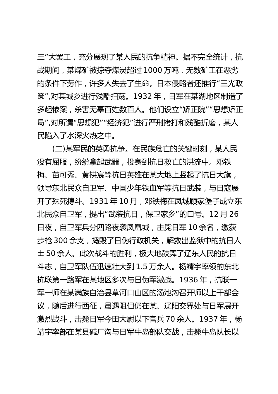 抗戰(zhàn)精神專題黨課講稿:緬懷先烈、銘記初心,從偉大抗戰(zhàn)精神中汲取奮進(jìn)力量今天,我們在這里隆重舉行紀(jì)念中國人民抗日戰(zhàn)爭暨世界反法西斯戰(zhàn)爭勝利80周年專題黨課,旨在通過回顧那段血與火的歷史,緬懷先烈、銘記初心,從偉大抗戰(zhàn)精神中汲取奮進(jìn)力量,推動某在新時代全面振興新突破中展現(xiàn)更大擔(dān)當(dāng)作為。80年前,中國人民經(jīng)過14年艱苦卓絕的浴血奮戰(zhàn),取得了抗日戰(zhàn)爭的偉大勝利,這是近代以來中國反抗外敵入侵的第一次完全勝利,徹底粉碎了日本軍國主義殖民奴役中國的圖謀,重新確立了中國在世界上的大國地位,開辟了中華民族偉大復(fù)興的光明前景。在這場波瀾壯闊的民族解放...
