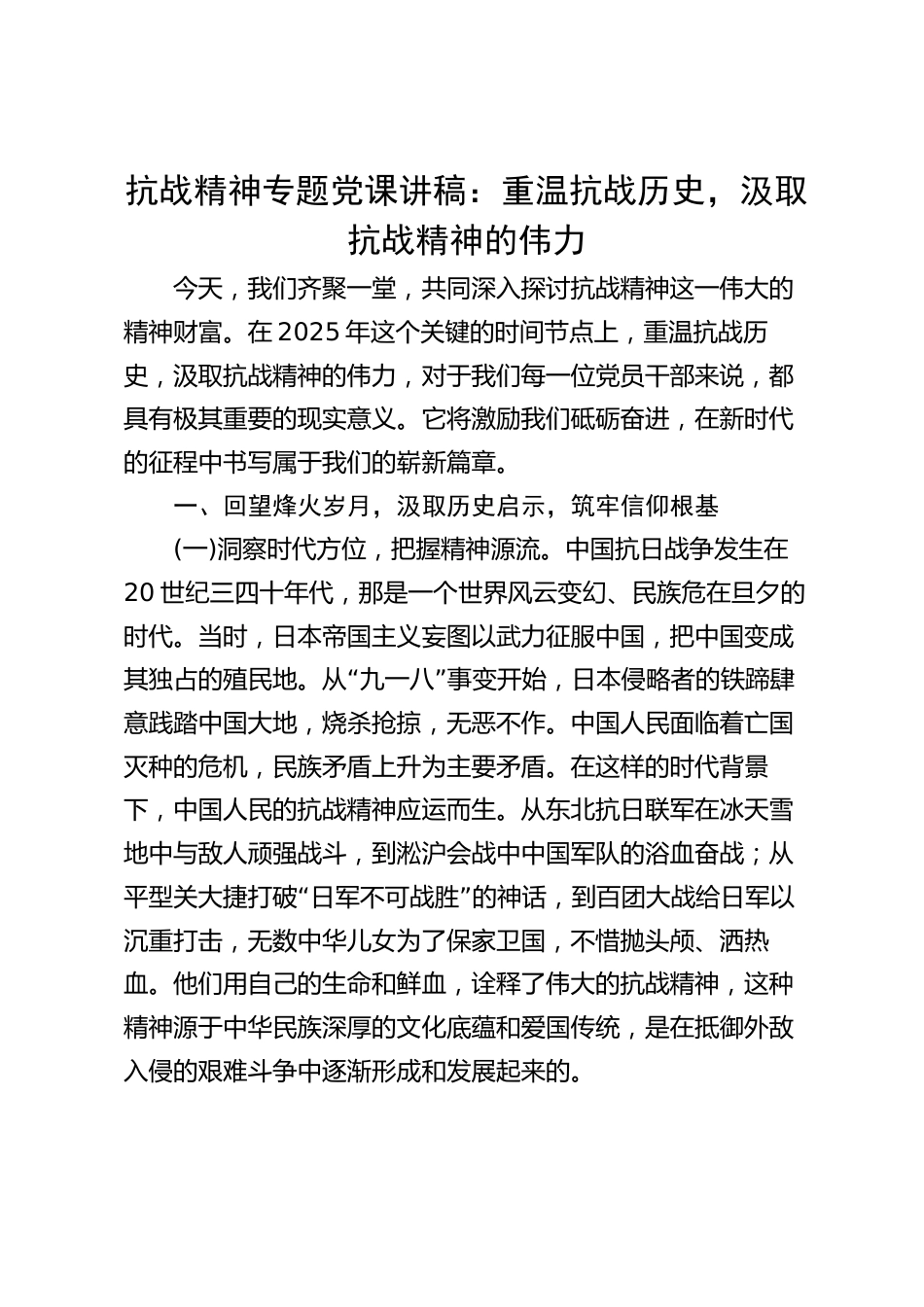 抗戰(zhàn)精神專題黨課講稿:重溫抗戰(zhàn)歷史,汲取抗戰(zhàn)精神的偉力今天,我們齊聚一堂,共同深入探討抗戰(zhàn)精神這一偉大的精神財富。在2025年這個關(guān)鍵的時間節(jié)點上,重溫抗戰(zhàn)歷史,汲取抗戰(zhàn)精神的偉力,對于我們每一位黨員干部來說,都具有極其重要的現(xiàn)實意義。它將激勵我們砥礪奮進,在新時代的征程中書寫屬于我們的嶄新篇章。一、回望烽火歲月,汲取歷史啟示,筑牢信仰根基(一)洞察時代方位,把握精神源流。中國抗日戰(zhàn)爭發(fā)生在20世紀三四十年代,那是一個世界風云變幻、民族危在旦夕的時代。當時,日本帝國主義妄圖以武力征服中國,把中國變成“”其獨占的殖民地。從九一八事變開...