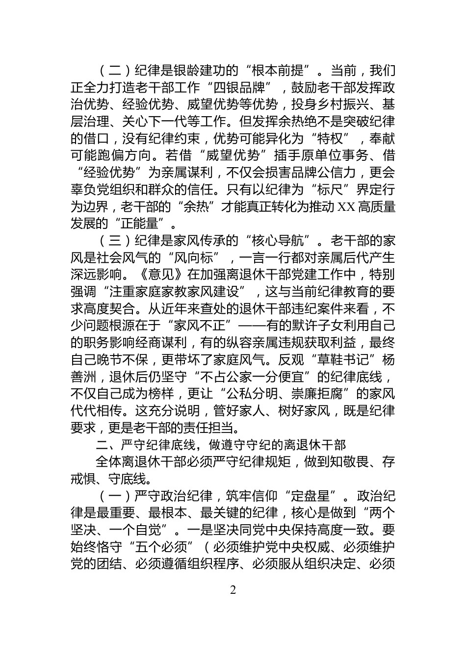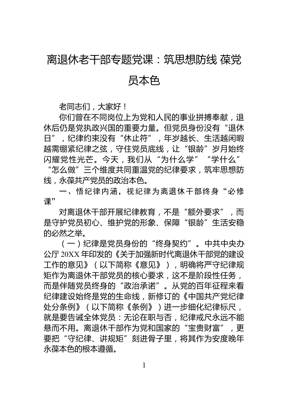 離退休老干部專題黨課:筑思想防線葆黨員本色老同志們,大家好!你們?cè)诓煌瑣徫簧蠟辄h和人民的事業(yè)拼搏奉獻(xiàn),退休后仍是黨執(zhí)政興國的重要力量。但黨員身份沒有“退休日”,紀(jì)律約束沒有“休止符”,年歲越長、生活越閑暇越需繃緊紀(jì)律之弦,守住黨員底線,讓“銀齡”歲月始終閃耀黨性光芒。今天,我們從“為什么學(xué)”“學(xué)什么”“怎么做”三個(gè)維度共同重溫黨的紀(jì)律要求,筑牢思想防線,永葆共產(chǎn)黨員的政治本色。一、悟紀(jì)律內(nèi)涵,視紀(jì)律為離退休干部終身“必修課”對(duì)離退休干部開展紀(jì)律教育,不是“額外要求”,而是守護(hù)黨員初心、維護(hù)黨的形象、保障“銀齡”生活安穩(wěn)的必...
