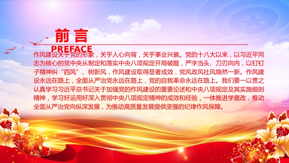 感謝您下載包圖網平臺上提供的PPT作品,為了您和包圖網以及原創(chuàng)作者的利益,請勿復制、傳播、銷售,否則將承擔法律責任!包圖網將對作品進行維權,按照傳播下載次數進行十倍的索取賠償!ibaotu.com持續(xù)深化黨的作風建設,為高質量發(fā)展提供堅強的紀律作風保障授課人:XXX時間:2025.09感謝您下載包圖網平臺上提供的PPT作品,為了您和包圖網以及原創(chuàng)作者的利益,請勿復制、傳播、銷售,否則將承擔法律責任!包圖網將對作品進行維權,按照傳播下載次數進行十倍的索取賠償!ibaotu.com前言PREFACE作風建設關乎黨的形象,關乎人心向背,關乎事業(yè)興衰。黨的十八大以來,以習近...