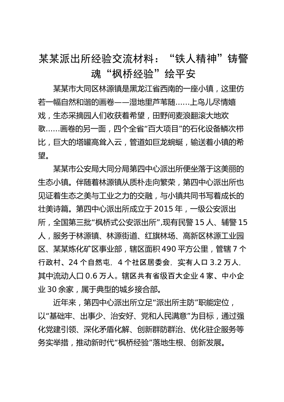 某某派出所經(jīng)驗交流材料:“鐵人精神”鑄警魂“楓橋經(jīng)驗”繪平安某某市大同區(qū)林源鎮(zhèn)是黑龍江省西南的一座小鎮(zhèn),這里仿若一幅自然和諧的畫卷——濕地里蘆葦隨......上鳥兒盡情嬉戲,生態(tài)采摘園人們收獲著希望,田野間麥浪翻滾大地歡歌......“”畫卷的另一面,四個全省百大項目的石化設(shè)備鱗次櫛比,巨大的塔罐高聳入云,管道如巨龍蜿蜒,輸送著小鎮(zhèn)的希望。某某市公安局大同分局第四中心派出所便坐落于這美麗的生態(tài)小鎮(zhèn)。伴隨著林源鎮(zhèn)從質(zhì)樸走向繁榮,第四中心派出所也見證著生態(tài)之美與工業(yè)之力的交融,與小鎮(zhèn)共同書寫著成長的壯美詩篇。第四中心派出所成立于2015年,一級...