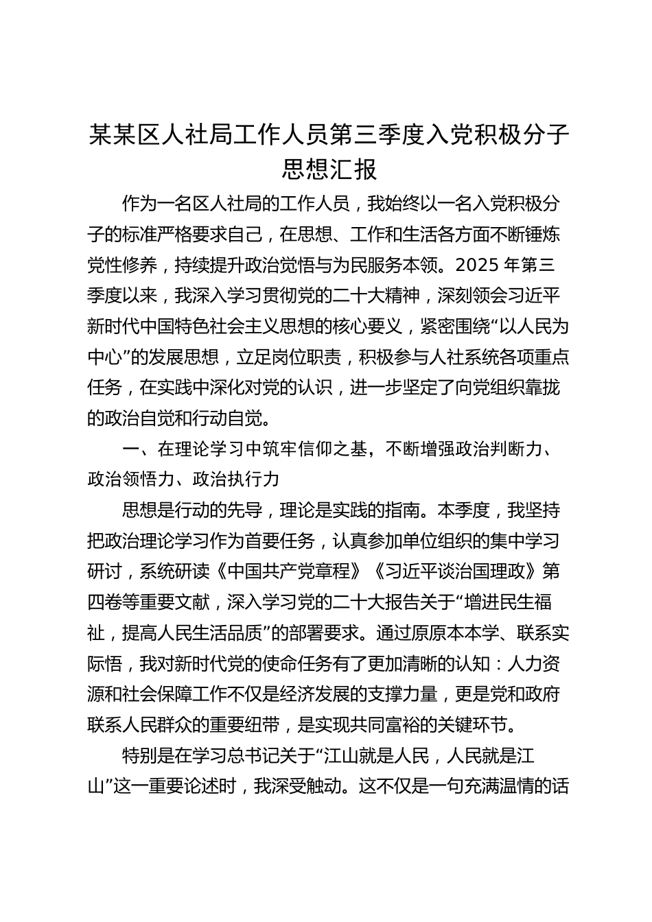 某某區(qū)人社局工作人員第三季度入黨積極分子思想?yún)R報
