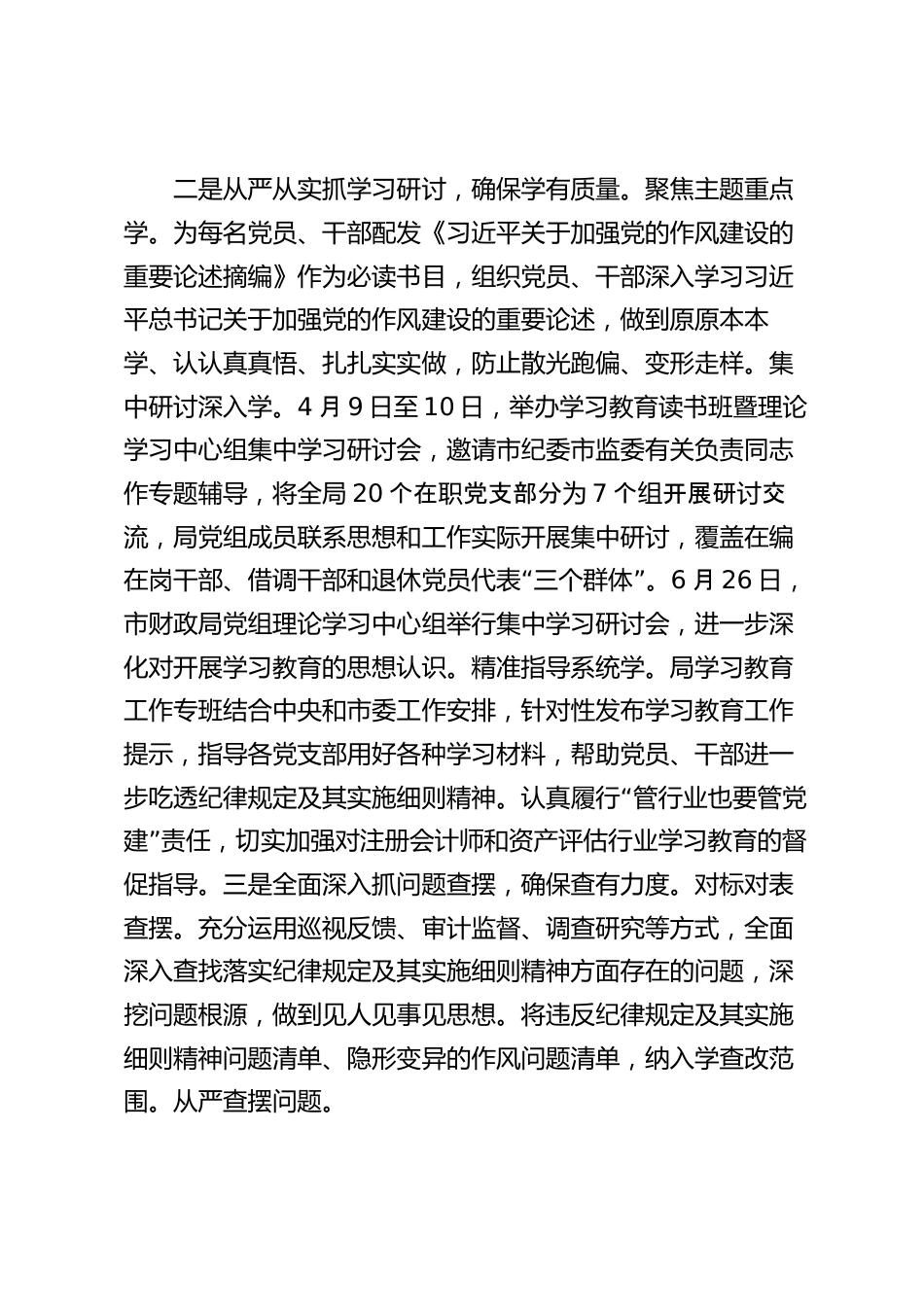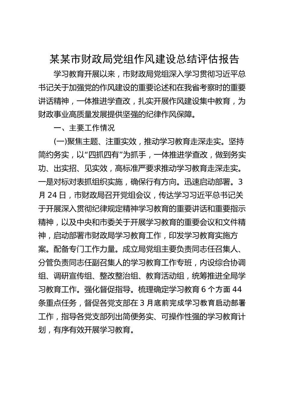 某某市財政局黨組作風建設總結(jié)評估報告學習教育開展以來,市財政局黨組深入學習貫徹習近平總書記關于加強黨的作風建設的重要論述和在我省考察時的重要講話精神,一體推進學查改,扎實開展作風建設集中教育,為財政事業(yè)高質(zhì)量發(fā)展提供堅強的紀律作風保障。一、主要工作情況(一)聚焦主題、注重實效,推動學習教育走深走實。堅持“”簡約務實,以四抓四有為抓手,一體推進學查改,做到務實功、出實招、見實效,高標準嚴要求推動學習教育走深走實。一是對標對表抓組織實施,確保行有方向。迅速啟動部署。3月24日,市財政局召開黨組會議,傳達學習習近平總書記關于開展深入貫...