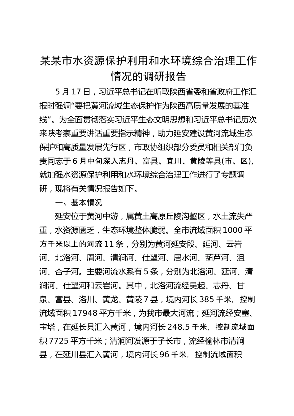 某某市水資源保護(hù)利用和水環(huán)境綜合治理工作情況的調(diào)研報告5月17日,習(xí)近平總書記在聽取陜西省委和省政府工作匯“報時強(qiáng)調(diào)要把黃河流域生態(tài)保護(hù)作為陜西高質(zhì)量發(fā)展的基準(zhǔn)”線。為全面貫徹落實(shí)習(xí)近平生態(tài)文明思想和習(xí)近平總書記歷次來陜考察重要講話重要指示精神,助力延安建設(shè)黃河流域生態(tài)保護(hù)和高質(zhì)量發(fā)展先行區(qū),市政協(xié)組織部分委員和相關(guān)部門負(fù)責(zé)同志于6月中旬深入志丹、富縣、宜川、黃陵等縣(市、區(qū)),就加強(qiáng)水資源保護(hù)利用和水環(huán)境綜合治理工作進(jìn)行了專題調(diào)研,現(xiàn)將有關(guān)情況報告如下。一、基本情況延安位于黃河中游,屬黃土高原丘陵溝壑區(qū),水土流失嚴(yán)重,水資源匱乏...