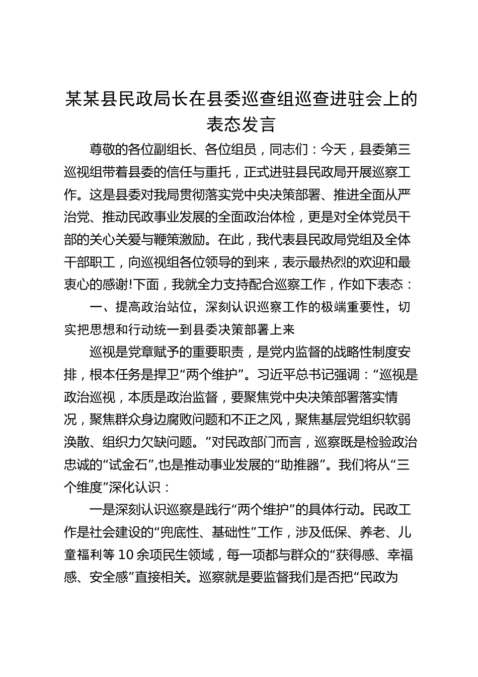 某某縣民政局長在縣委巡查組巡查進駐會上的表態(tài)發(fā)言尊敬的各位副組長、各位組員,同志們:今天,縣委第三巡視組帶著縣委的信任與重托,正式進駐縣民政局開展巡察工作。這是縣委對我局貫徹落實黨中央決策部署、推進全面從嚴治黨、推動民政事業(yè)發(fā)展的全面政治體檢,更是對全體黨員干部的關心關愛與鞭策激勵。在此,我代表縣民政局黨組及全體干部職工,向巡視組各位領導的到來,表示最熱烈的歡迎和最衷心的感謝!下面,我就全力支持配合巡察工作,作如下表態(tài):一、提高政治站位,深刻認識巡察工作的極端重要性,切實把思想和行動統(tǒng)一到縣委決策部署上來巡視是黨章賦予的重要...