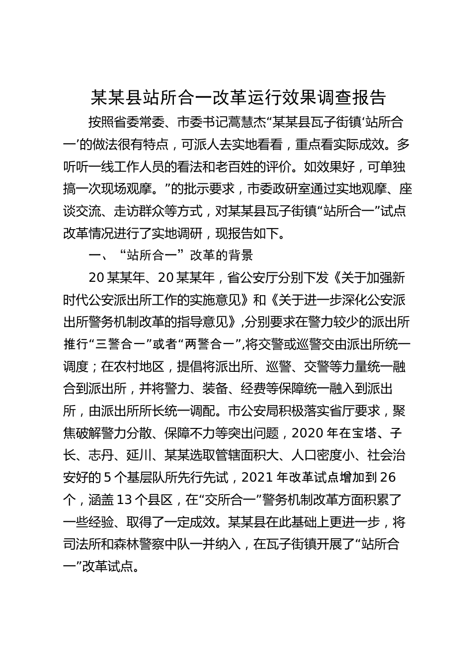 某某縣站所合一改革運行效果調查報告“‘按照省委常委、市委書記蒿慧杰某某縣瓦子街鎮(zhèn)站所合’一的做法很有特點,可派人去實地看看,重點看實際成效。多聽聽一線工作人員的看法和老百姓的評價。如效果好,可單獨”搞一次現(xiàn)場觀摩。的批示要求,市委政研室通過實地觀摩、座“”談交流、走訪群眾等方式,對某某縣瓦子街鎮(zhèn)站所合一試點改革情況進行了實地調研,現(xiàn)報告如下。一、“站所合一”改革的背景20某某年、20某某年,省公安廳分別下發(fā)《關于加強新時代公安派出所工作的實施意見》和《關于進一步深化公安派出所警務機制改革的指導意見》,分別要求在警力較少的派出所“...