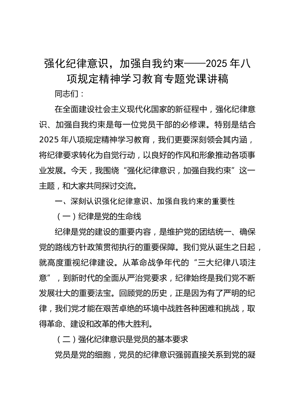 強(qiáng)化紀(jì)律意識,加強(qiáng)自我約束——2025年八項(xiàng)規(guī)定精神學(xué)習(xí)教育專題黨課講稿同志們:在全面建設(shè)社會主義現(xiàn)代化國家的新征程中,強(qiáng)化紀(jì)律意識、加強(qiáng)自我約束是每一位黨員干部的必修課。特別是結(jié)合2025年八項(xiàng)規(guī)定精神學(xué)習(xí)教育,我們更要深刻領(lǐng)會其內(nèi)涵,將紀(jì)律要求轉(zhuǎn)化為自覺行動(dòng),以良好的作風(fēng)和形象推動(dòng)各項(xiàng)事業(yè)發(fā)展。今天,我圍繞“強(qiáng)化紀(jì)律意識,加強(qiáng)自我約束”這一主題,和大家共同探討交流。一、深刻認(rèn)識強(qiáng)化紀(jì)律意識、加強(qiáng)自我約束的重要性(一)紀(jì)律是黨的生命線紀(jì)律是黨的建設(shè)的重要內(nèi)容,是維護(hù)黨的團(tuán)結(jié)統(tǒng)一、確保黨的路線方針政策貫徹執(zhí)行的重要保障。我們黨從誕生...