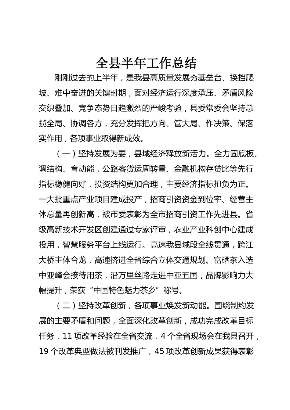 全縣半年工作總結(jié)剛剛過去的上半年,是我縣高質(zhì)量發(fā)展夯基壘臺、換擋爬坡、難中奮進(jìn)的關(guān)鍵時(shí)期,面對經(jīng)濟(jì)運(yùn)行深度承壓、矛盾風(fēng)險(xiǎn)交織疊加、競爭態(tài)勢日趨激烈的嚴(yán)峻考驗(yàn),縣委常委會堅(jiān)持總攬全局、協(xié)調(diào)各方,充分發(fā)揮把方向、管大局、作決策、保落實(shí)作用,各項(xiàng)事業(yè)取得新成效。(一)堅(jiān)持發(fā)展為要,縣域經(jīng)濟(jì)釋放新活力。全力固底板、調(diào)結(jié)構(gòu)、育動能,公路客貨運(yùn)周轉(zhuǎn)量、金融機(jī)構(gòu)存貸比等先行指標(biāo)穩(wěn)健向好,投資結(jié)構(gòu)更加合理,主要經(jīng)濟(jì)指標(biāo)扭負(fù)為正。一大批重點(diǎn)產(chǎn)業(yè)項(xiàng)目建成投產(chǎn),招商引資資金到位率、經(jīng)營主體總量再創(chuàng)新高,被市委表彰為全市招商引資工作先進(jìn)縣。省級高新...