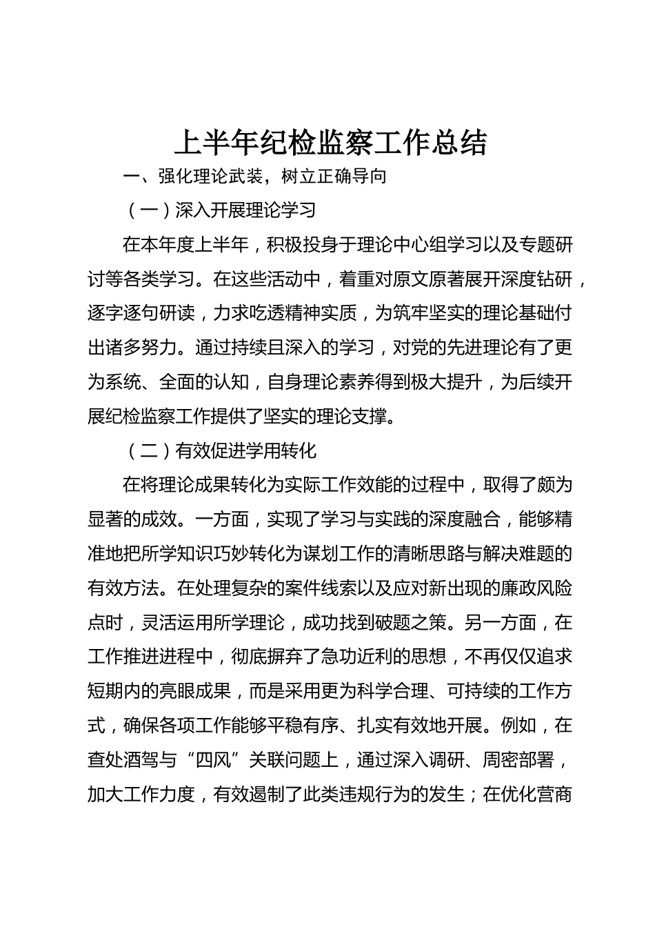 上半年紀(jì)檢監(jiān)察工作總結(jié)一、強(qiáng)化理論武裝,樹立正確導(dǎo)向(一)深入開展理論學(xué)習(xí)在本年度上半年,積極投身于理論中心組學(xué)習(xí)以及專題研討等各類學(xué)習(xí)。在這些活動中,著重對原文原著展開深度鉆研,逐字逐句研讀,力求吃透精神實質(zhì),為筑牢堅實的理論基礎(chǔ)付出諸多努力。通過持續(xù)且深入的學(xué)習(xí),對黨的先進(jìn)理論有了更為系統(tǒng)、全面的認(rèn)知,自身理論素養(yǎng)得到極大提升,為后續(xù)開展紀(jì)檢監(jiān)察工作提供了堅實的理論支撐。(二)有效促進(jìn)學(xué)用轉(zhuǎn)化在將理論成果轉(zhuǎn)化為實際工作效能的過程中,取得了頗為顯著的成效。一方面,實現(xiàn)了學(xué)習(xí)與實踐的深度融合,能夠精準(zhǔn)地把所學(xué)知識巧妙轉(zhuǎn)化為謀...