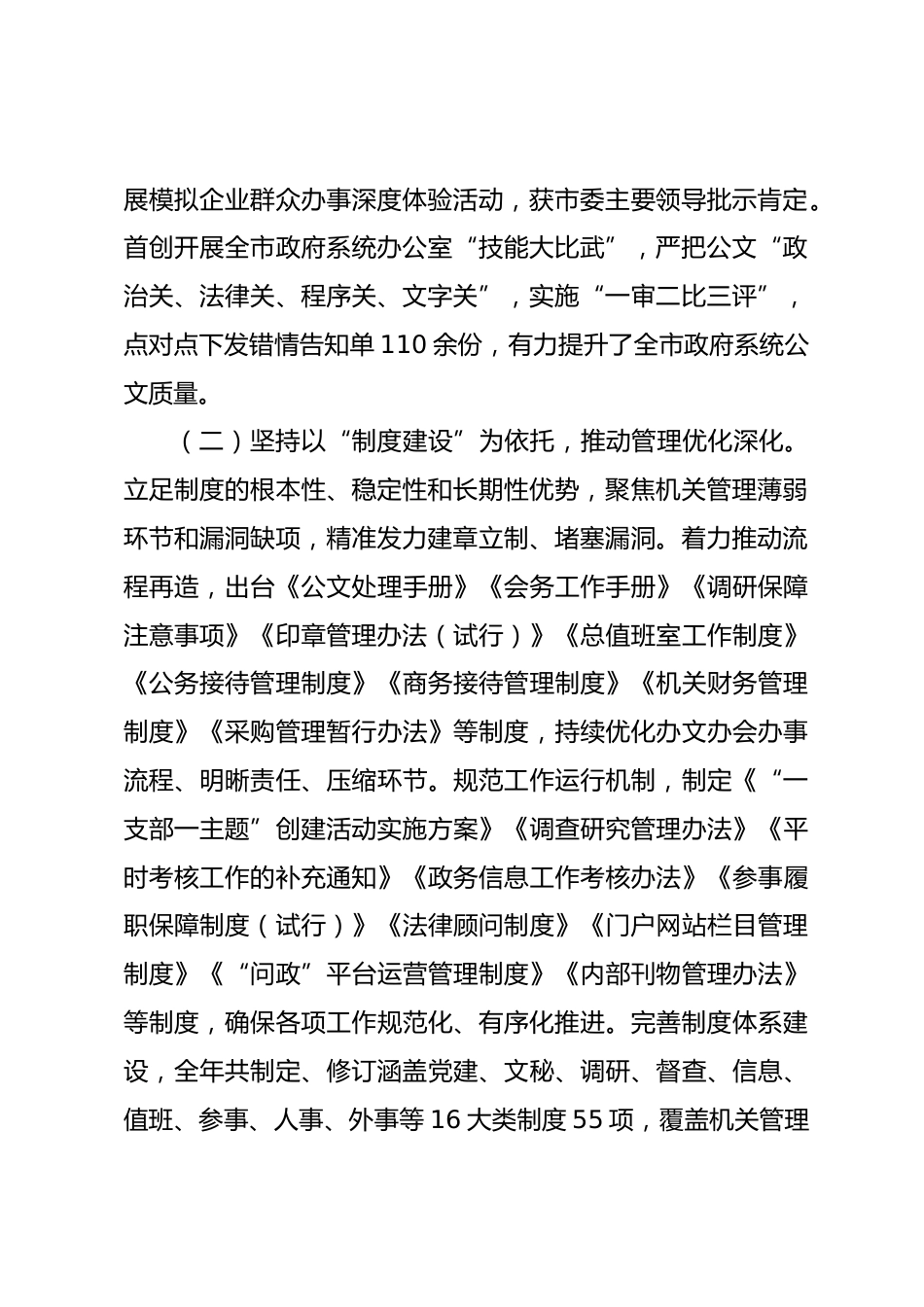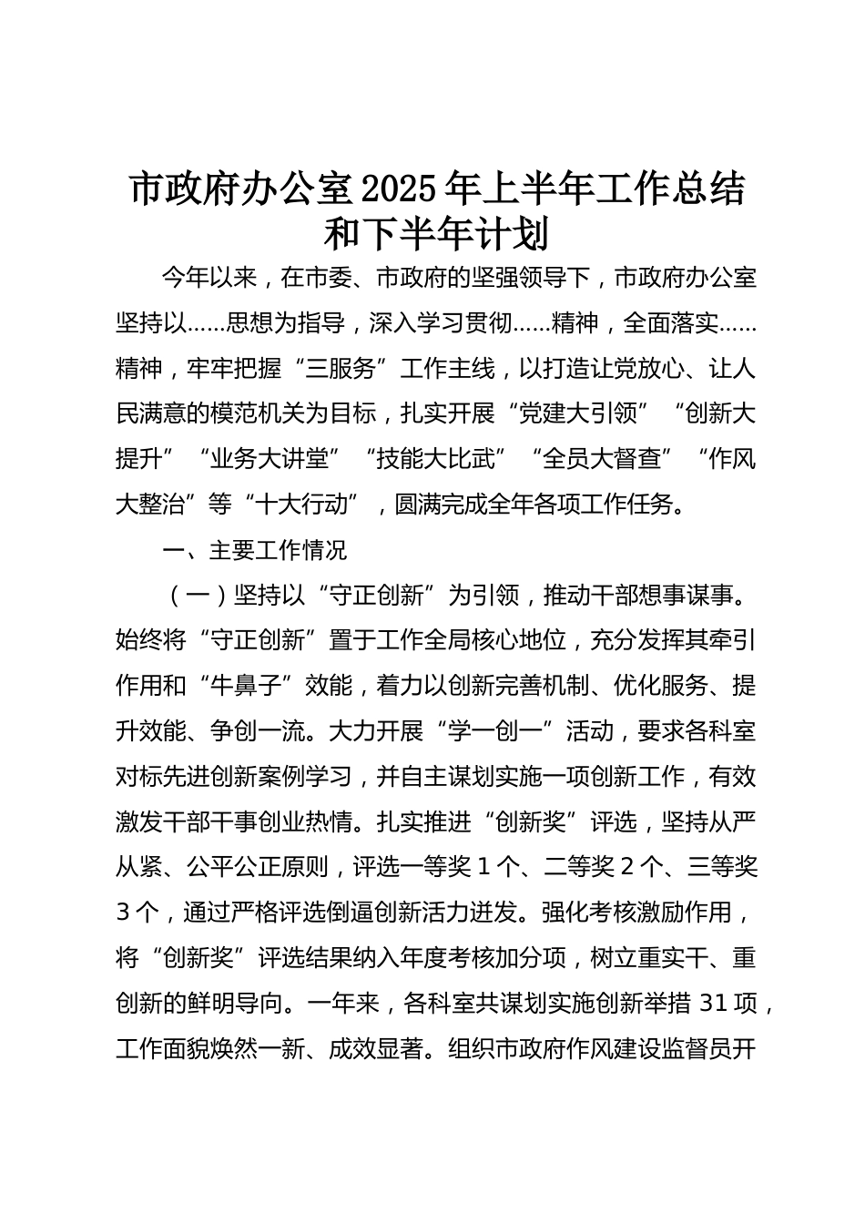 ?市政府辦公室2025年上半年工作總結(jié)和下半年計劃今年以來,在市委、市政府的堅強(qiáng)領(lǐng)導(dǎo)下,市政府辦公室堅持以……思想為指導(dǎo),深入學(xué)習(xí)貫徹……精神,全面落實……精神,牢牢把握“三服務(wù)”工作主線,以打造讓黨放心、讓人民滿意的模范機(jī)關(guān)為目標(biāo),扎實開展“黨建大引領(lǐng)”“創(chuàng)新大提升”“業(yè)務(wù)大講堂”“技能大比武”“全員大督查”“作風(fēng)大整治”等“十大行動”,圓滿完成全年各項工作任務(wù)。一、主要工作情況?(一)堅持以“守正創(chuàng)新”為引領(lǐng),推動干部想事謀事?。始終將“守正創(chuàng)新”置于工作全局核心地位,充分發(fā)揮其牽引作用和“牛鼻子”效能,著力以創(chuàng)新完善機(jī)制、...
