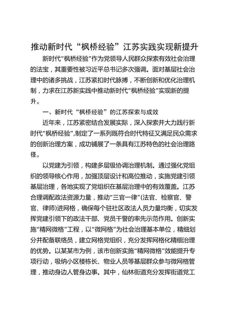 推動新時代“楓橋經驗”江蘇實踐實現新提升“”新時代楓橋經驗作為黨領導人民群眾探索有效社會治理的法寶,其重要性被習近平總書記多次強調。面對基層社會治理中的諸多挑戰(zhàn),江蘇緊扣時代脈搏,不斷創(chuàng)新和優(yōu)化治理機“”制,力求在江蘇新實踐中推動新時代楓橋經驗實現新的提升。一、新時代“楓橋經驗”的江蘇探索與成效近年來,江蘇緊密結合發(fā)展實際,深入探索并大力踐行新“”時代楓橋經驗,制定了一系列既符合時代特征又滿足民眾需求的創(chuàng)新治理方案,成功鋪展了一條具有江蘇特色的社會治理路徑。以黨建為引領,構建多層級協調治理機制。通過強化黨組織的領導核心作用,...