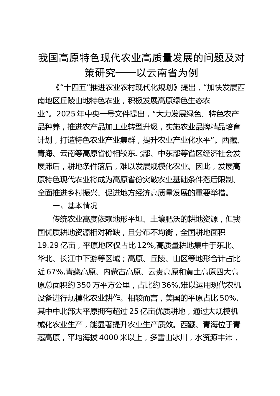 我國(guó)高原特色現(xiàn)代農(nóng)業(yè)高質(zhì)量發(fā)展的問(wèn)題及對(duì)策研究——以云南省為例“”“《十四五推進(jìn)農(nóng)業(yè)農(nóng)村現(xiàn)代化規(guī)劃》提出,加快發(fā)展西南地區(qū)丘陵山地特色農(nóng)業(yè),積極發(fā)展高原綠色生態(tài)農(nóng)”業(yè)。2025“年中央一號(hào)文件提出,大力發(fā)展綠色、特色農(nóng)產(chǎn)品種養(yǎng),推進(jìn)農(nóng)產(chǎn)品加工業(yè)轉(zhuǎn)型升級(jí),實(shí)施農(nóng)業(yè)品牌精品培育”計(jì)劃,打造特色農(nóng)業(yè)產(chǎn)業(yè)集群,提升農(nóng)業(yè)產(chǎn)業(yè)化水平。西藏、青海、云南等高原省份相較東北部、中東部等省區(qū)經(jīng)濟(jì)社會(huì)發(fā)展滯后,耕地條件落后,難以發(fā)展規(guī)?;r(nóng)業(yè)。因此,發(fā)展高原特色現(xiàn)代農(nóng)業(yè)將成為高原省份突破農(nóng)業(yè)基礎(chǔ)條件落后限制、全面推進(jìn)鄉(xiāng)村振興、促進(jìn)地方經(jīng)濟(jì)高質(zhì)量發(fā)展的...