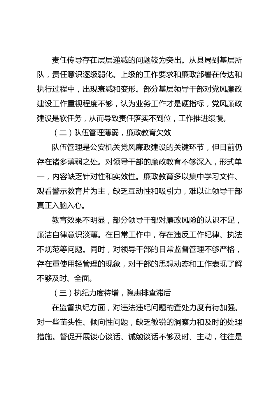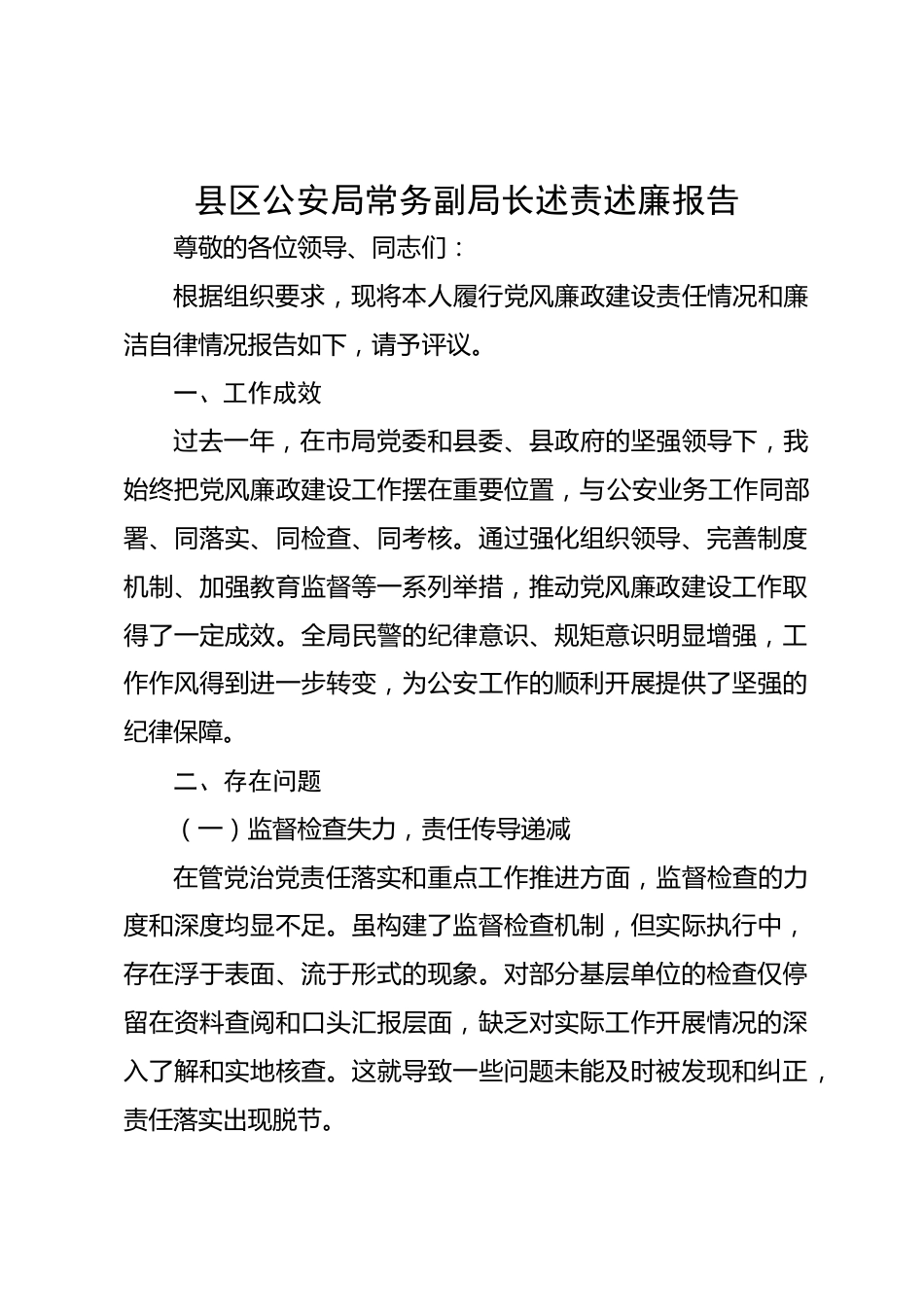 縣區(qū)公安局常務(wù)副局長述責(zé)述廉報(bào)告尊敬的各位領(lǐng)導(dǎo)、同志們:根據(jù)組織要求,現(xiàn)將本人履行黨風(fēng)廉政建設(shè)責(zé)任情況和廉潔自律情況報(bào)告如下,請(qǐng)予評(píng)議。一、工作成效過去一年,在市局黨委和縣委、縣政府的堅(jiān)強(qiáng)領(lǐng)導(dǎo)下,我始終把黨風(fēng)廉政建設(shè)工作擺在重要位置,與公安業(yè)務(wù)工作同部署、同落實(shí)、同檢查、同考核。通過強(qiáng)化組織領(lǐng)導(dǎo)、完善制度機(jī)制、加強(qiáng)教育監(jiān)督等一系列舉措,推動(dòng)黨風(fēng)廉政建設(shè)工作取得了一定成效。全局民警的紀(jì)律意識(shí)、規(guī)矩意識(shí)明顯增強(qiáng),工作作風(fēng)得到進(jìn)一步轉(zhuǎn)變,為公安工作的順利開展提供了堅(jiān)強(qiáng)的紀(jì)律保障。二、存在問題(一)監(jiān)督檢查失力,責(zé)任傳導(dǎo)遞減在管黨治...