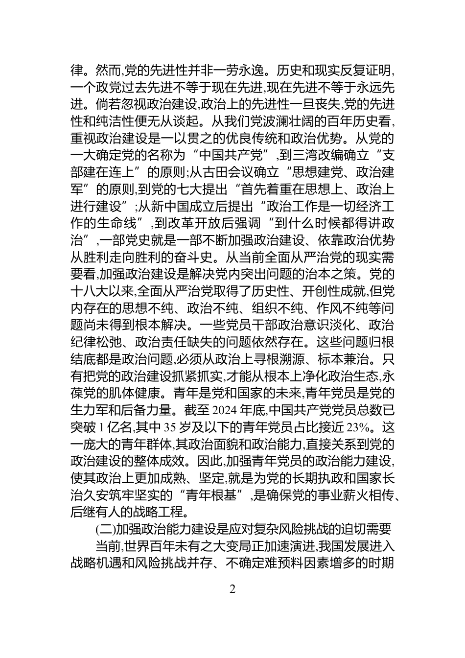 縣委辦公室專題黨課:錘煉政治品格、勇?lián)鷷r代使命同志們:旗幟鮮明講政治是我們黨作為馬克思主義政黨的根本要求。今天,我們圍繞“錘煉政治品格、勇?lián)鷷r代使命”這一主題,共同探討新時代青年黨員政治能力建設的重大意義、核心內涵與實踐路徑。這既是一次理論學習,更是一次思想上的對標看齊。希望通過本次黨課,大家能對青年黨員的政治責任有更深刻的認識,對自身成長路徑有更清晰的規(guī)劃。一、高瞻遠矚,深刻認識新時代青年黨員政治能力建設的戰(zhàn)略意義政治能力,是黨員干部干事創(chuàng)業(yè)的根本,是排在第一位的能力。對青年黨員而言,政治能力的高低,不僅決定著個人的成長高度,更深刻影...