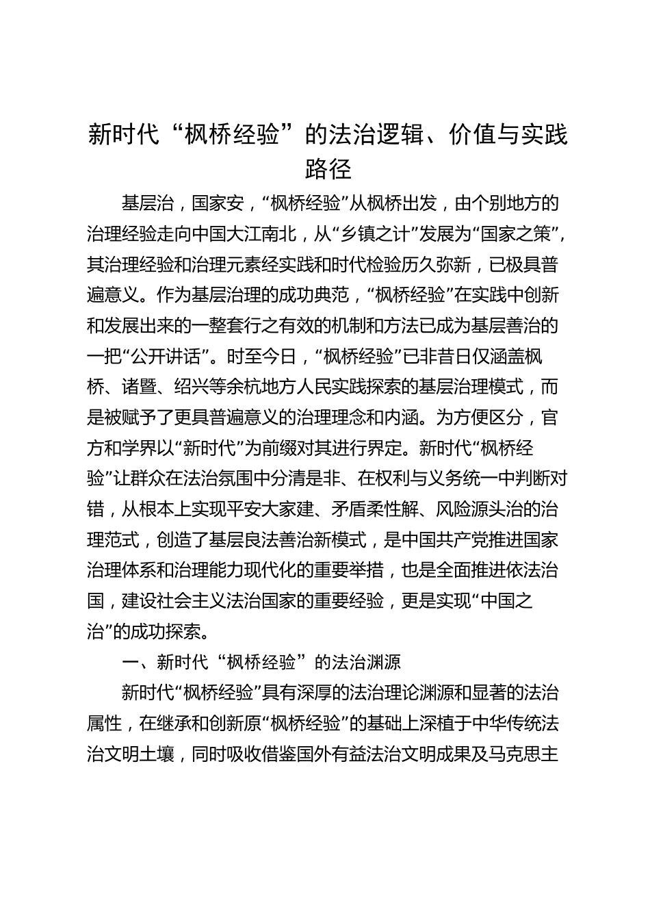 新時(shí)代“楓橋經(jīng)驗(yàn)”的法治邏輯、價(jià)值與實(shí)踐路徑“”基層治,國(guó)家安,楓橋經(jīng)驗(yàn)從楓橋出發(fā),由個(gè)別地方的“”“”治理經(jīng)驗(yàn)走向中國(guó)大江南北,從鄉(xiāng)鎮(zhèn)之計(jì)發(fā)展為國(guó)家之策,其治理經(jīng)驗(yàn)和治理元素經(jīng)實(shí)踐和時(shí)代檢驗(yàn)歷久彌新,已極具普“”遍意義。作為基層治理的成功典范,楓橋經(jīng)驗(yàn)在實(shí)踐中創(chuàng)新和發(fā)展出來(lái)的一整套行之有效的機(jī)制和方法已成為基層善治的“”“”一把公開(kāi)講話。時(shí)至今日,楓橋經(jīng)驗(yàn)已非昔日僅涵蓋楓橋、諸暨、紹興等余杭地方人民實(shí)踐探索的基層治理模式,而是被賦予了更具普遍意義的治理理念和內(nèi)涵。為方便區(qū)分,官“”“方和學(xué)界以新時(shí)代為前綴對(duì)其進(jìn)行界定。新時(shí)...