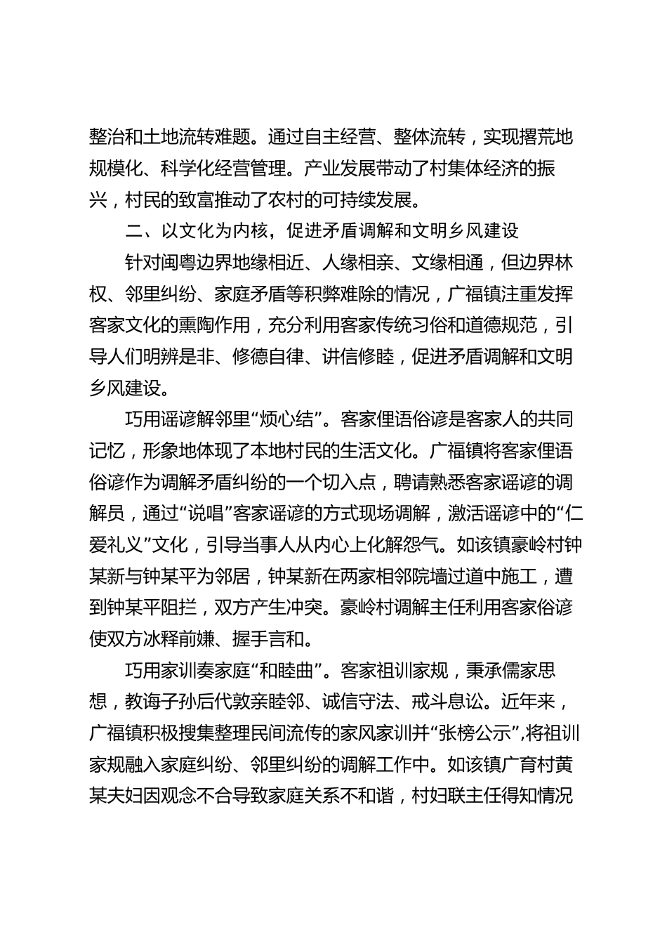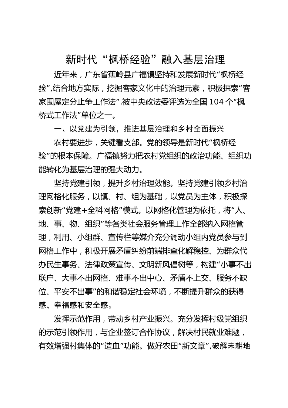 新時(shí)代“楓橋經(jīng)驗(yàn)”融入基層治理“近年來,廣東省蕉嶺縣廣福鎮(zhèn)堅(jiān)持和發(fā)展新時(shí)代楓橋經(jīng)”驗(yàn),“結(jié)合地方實(shí)際,挖掘客家文化中的治理元素,積極探索客”家圍屋定分止?fàn)幑ぷ鞣?被中央政法委評選為全國104“個(gè)楓”橋式工作法單位之一。一、以黨建為引領(lǐng),推進(jìn)基層治理和鄉(xiāng)村全面振興“農(nóng)村要進(jìn)步,關(guān)鍵看支部。黨的領(lǐng)導(dǎo)是新時(shí)代楓橋經(jīng)”驗(yàn)的根本保障。廣福鎮(zhèn)努力把農(nóng)村黨組織的政治功能、組織功能轉(zhuǎn)化為基層治理的強(qiáng)大動力。堅(jiān)持黨建引領(lǐng),提升鄉(xiāng)村治理效能。堅(jiān)持黨建引領(lǐng)鄉(xiāng)村治理網(wǎng)格化服務(wù),以鎮(zhèn)、村、組為基礎(chǔ),以黨員為主體,積極探“索創(chuàng)新黨建+”“全科網(wǎng)格模式。以網(wǎng)格...