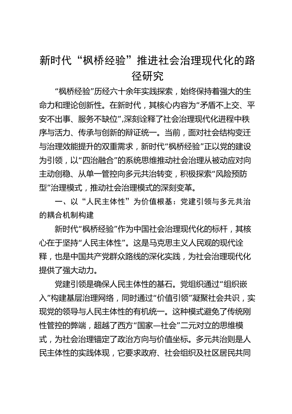 新時代“楓橋經(jīng)驗”推進(jìn)社會治理現(xiàn)代化的路徑研究“”楓橋經(jīng)驗歷經(jīng)六十余年實踐探索,始終保持著強(qiáng)大的生“命力和理論創(chuàng)新性。在新時代,其核心內(nèi)容為矛盾不上交、平”安不出事、服務(wù)不缺位,深刻詮釋了社會治理現(xiàn)代化進(jìn)程中秩序與活力、傳承與創(chuàng)新的辯證統(tǒng)一。當(dāng)前,面對社會結(jié)構(gòu)變遷“”與治理效能提升的雙重需求,新時代楓橋經(jīng)驗正以黨的建設(shè)“”為引領(lǐng),以四治融合的系統(tǒng)思維推動社會治理從被動應(yīng)對向“主動創(chuàng)穩(wěn)、從單一管控向多元共治轉(zhuǎn)變,積極探索風(fēng)險預(yù)防”型治理模式,推動社會治理模式的深刻變革。一、以“人民主體性”為價值根基:黨建引領(lǐng)與多元共治的耦合機(jī)...
