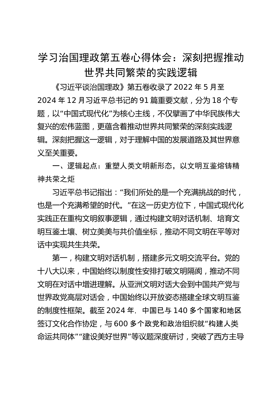 學(xué)習(xí)治國(guó)理政第五卷心得體會(huì):深刻把握推動(dòng)世界共同繁榮的實(shí)踐邏輯《習(xí)近平談治國(guó)理政》第五卷收錄了2022年5月至2024年12月近平的習(xí)總書(shū)記91篇重要文獻(xiàn),分為18個(gè)專(zhuān)“”題,以中國(guó)式現(xiàn)代化為核心主線(xiàn),不僅擘畫(huà)了中華民族偉大復(fù)興的宏偉藍(lán)圖,更蘊(yùn)含著推動(dòng)世界共同繁榮的深刻實(shí)踐邏輯。深刻把握這一邏輯,對(duì)于理解中國(guó)的發(fā)展道路及其世界意義至關(guān)重要。一、邏輯起點(diǎn):重塑人類(lèi)文明新形態(tài),以文明互鑒熔鑄精神共榮之炬“習(xí)近平總書(shū)記指出:我們所處的是一個(gè)充滿(mǎn)挑戰(zhàn)的時(shí)代,”也是一個(gè)充滿(mǎn)希望的時(shí)代。在這一歷史方位下,中國(guó)式現(xiàn)代化實(shí)踐正在重構(gòu)文明敘事邏輯,通過(guò)構(gòu)建...