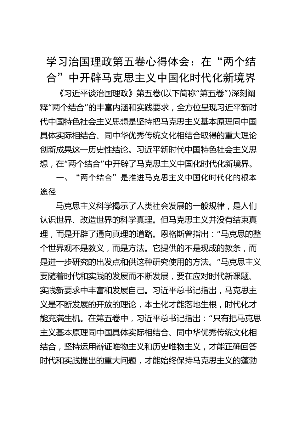 學習治國理政第五卷心得體會:在“兩個結(jié)合”中開辟馬克思主義中國化時代化新境界VIP免費