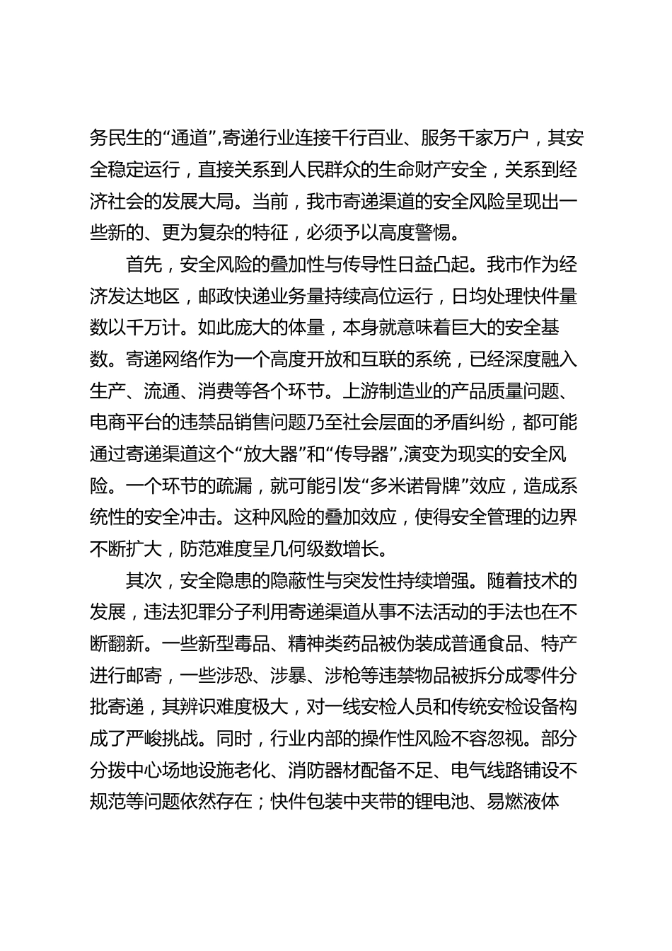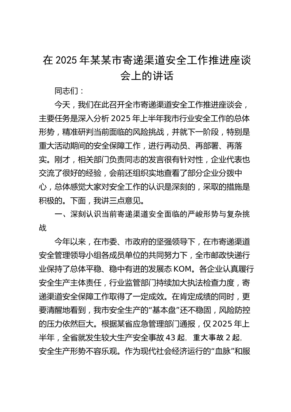 在2025年某某市寄遞渠道安全工作推進(jìn)座談會上的講話同志們:今天,我們在此召開全市寄遞渠道安全工作推進(jìn)座談會,主要任務(wù)是深入分析2025年上半年我市行業(yè)安全工作的總體形勢,精準(zhǔn)研判當(dāng)前面臨的風(fēng)險挑戰(zhàn),并就下一階段,特別是重大活動期間的安全保障工作,進(jìn)行再動員、再部署、再落實。剛才,相關(guān)部門負(fù)責(zé)同志的發(fā)言很有針對性,企業(yè)代表也交流了很好的經(jīng)驗,會前還組織實地查看了部分企業(yè)分撥中心,總體感覺大家對安全工作的認(rèn)識是深刻的,采取的措施是積極的。下面,我講三點意見。一、深刻認(rèn)識當(dāng)前寄遞渠道安全面臨的嚴(yán)峻形勢與復(fù)雜挑戰(zhàn)今年以來,在市委、市政府的...