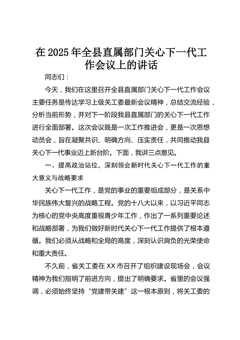 在2025年全縣直屬部門關(guān)心下一代工作會議上的講話同志們:今天,我們在這里召開全縣直屬部門關(guān)心下一代工作會議主要任務(wù)是傳達學(xué)習(xí)上級關(guān)工委最新會議精神,總結(jié)交流經(jīng)驗,分析當(dāng)前形勢,并對下一階段我縣直屬部門的關(guān)心下一代工作進行全面部署。這次會議既是一次工作推進會,更是一次思想動員會,旨在凝聚共識、明確方向、壓實責(zé)任,共同推動我縣關(guān)心下一代事業(yè)邁上新臺階。下面,我講三點意見。一、提高政治站位,深刻領(lǐng)會新時代關(guān)心下一代工作的重大意義與戰(zhàn)略要求關(guān)心下一代工作,是黨的事業(yè)的重要組成部分,是關(guān)系中華民族偉大復(fù)興的戰(zhàn)略工程。黨的十八大以來,以習(xí)...