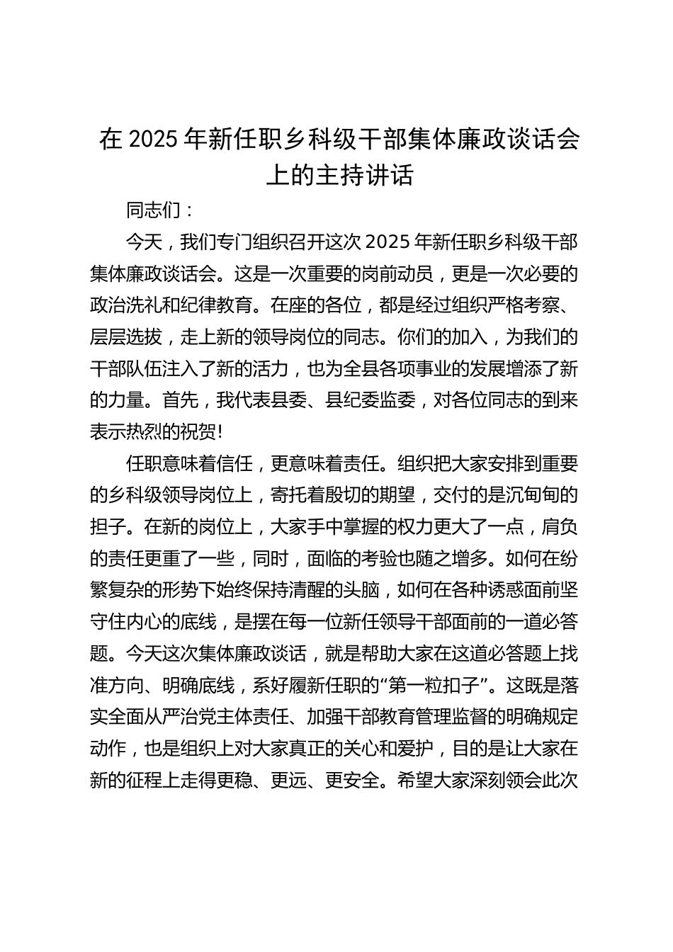 在2025年新任職鄉(xiāng)科級(jí)干部集體廉政談話會(huì)上的主持講話同志們:今天,我們專門組織召開這次2025年新任職鄉(xiāng)科級(jí)干部集體廉政談話會(huì)。這是一次重要的崗前動(dòng)員,更是一次必要的政治洗禮和紀(jì)律教育。在座的各位,都是經(jīng)過(guò)組織嚴(yán)格考察、層層選拔,走上新的領(lǐng)導(dǎo)崗位的同志。你們的加入,為我們的干部隊(duì)伍注入了新的活力,也為全縣各項(xiàng)事業(yè)的發(fā)展增添了新的力量。首先,我代表縣委、縣紀(jì)委監(jiān)委,對(duì)各位同志的到來(lái)表示熱烈的祝賀!任職意味著信任,更意味著責(zé)任。組織把大家安排到重要的鄉(xiāng)科級(jí)領(lǐng)導(dǎo)崗位上,寄托著殷切的期望,交付的是沉甸甸的擔(dān)子。在新的崗位上,大家手中掌握的...
