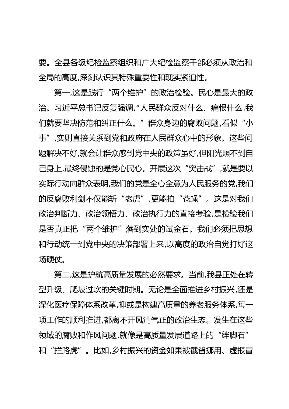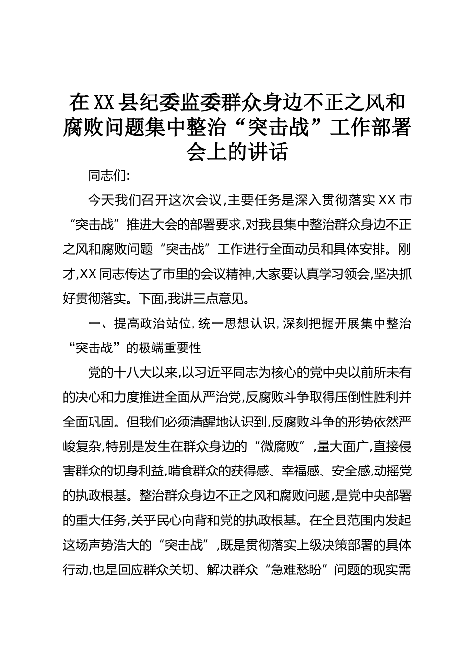 在XX縣紀(jì)委監(jiān)委群眾身邊不正之風(fēng)和腐敗問題集中整治“突擊戰(zhàn)”工作部署會(huì)上的講話同志們:今天我們召開這次會(huì)議,主要任務(wù)是深入貫徹落實(shí)XX市“突擊戰(zhàn)”推進(jìn)大會(huì)的部署要求,對(duì)我縣集中整治群眾身邊不正之風(fēng)和腐敗問題“突擊戰(zhàn)”工作進(jìn)行全面動(dòng)員和具體安排。剛才,XX同志傳達(dá)了市里的會(huì)議精神,大家要認(rèn)真學(xué)習(xí)領(lǐng)會(huì),堅(jiān)決抓好貫徹落實(shí)。下面,我講三點(diǎn)意見。一、提高政治站位,統(tǒng)一思想認(rèn)識(shí),深刻把握開展集中整治“突擊戰(zhàn)”的極端重要性黨的十八大以來,以習(xí)近平同志為核心的黨中央以前所未有的決心和力度推進(jìn)全面從嚴(yán)治黨,反腐敗斗爭取得壓倒性勝利并全面鞏固。但我們必須清醒地...