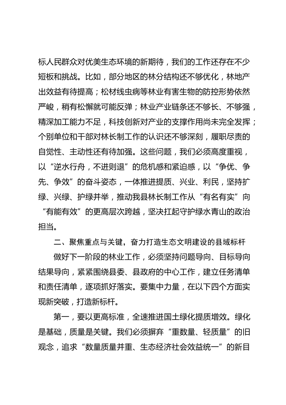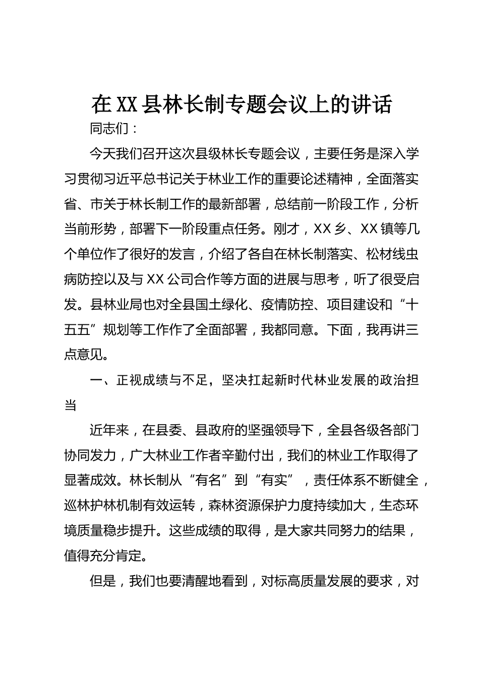在XX縣林長(zhǎng)制專題會(huì)議上的講話同志們:今天我們召開這次縣級(jí)林長(zhǎng)專題會(huì)議,主要任務(wù)是深入學(xué)習(xí)貫徹習(xí)近平總書記關(guān)于林業(yè)工作的重要論述精神,全面落實(shí)省、市關(guān)于林長(zhǎng)制工作的最新部署,總結(jié)前一階段工作,分析當(dāng)前形勢(shì),部署下一階段重點(diǎn)任務(wù)。剛才,XX鄉(xiāng)、XX鎮(zhèn)等幾個(gè)單位作了很好的發(fā)言,介紹了各自在林長(zhǎng)制落實(shí)、松材線蟲病防控以及與XX公司合作等方面的進(jìn)展與思考,聽了很受啟發(fā)??h林業(yè)局也對(duì)全縣國(guó)土綠化、疫情防控、項(xiàng)目建設(shè)和“十五五”規(guī)劃等工作作了全面部署,我都同意。下面,我再講三點(diǎn)意見。一、正視成績(jī)與不足,堅(jiān)決扛起新時(shí)代林業(yè)發(fā)展的政治擔(dān)當(dāng)近年來,在...