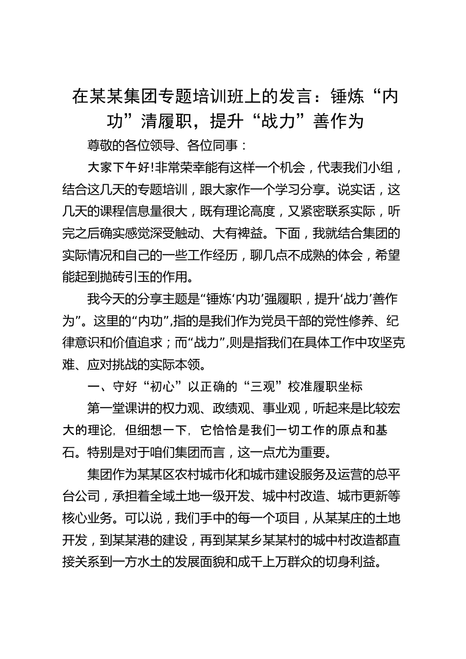 在某某集團專題培訓班上的發(fā)言:錘煉“內(nèi)功”清履職,提升“戰(zhàn)力”善作為