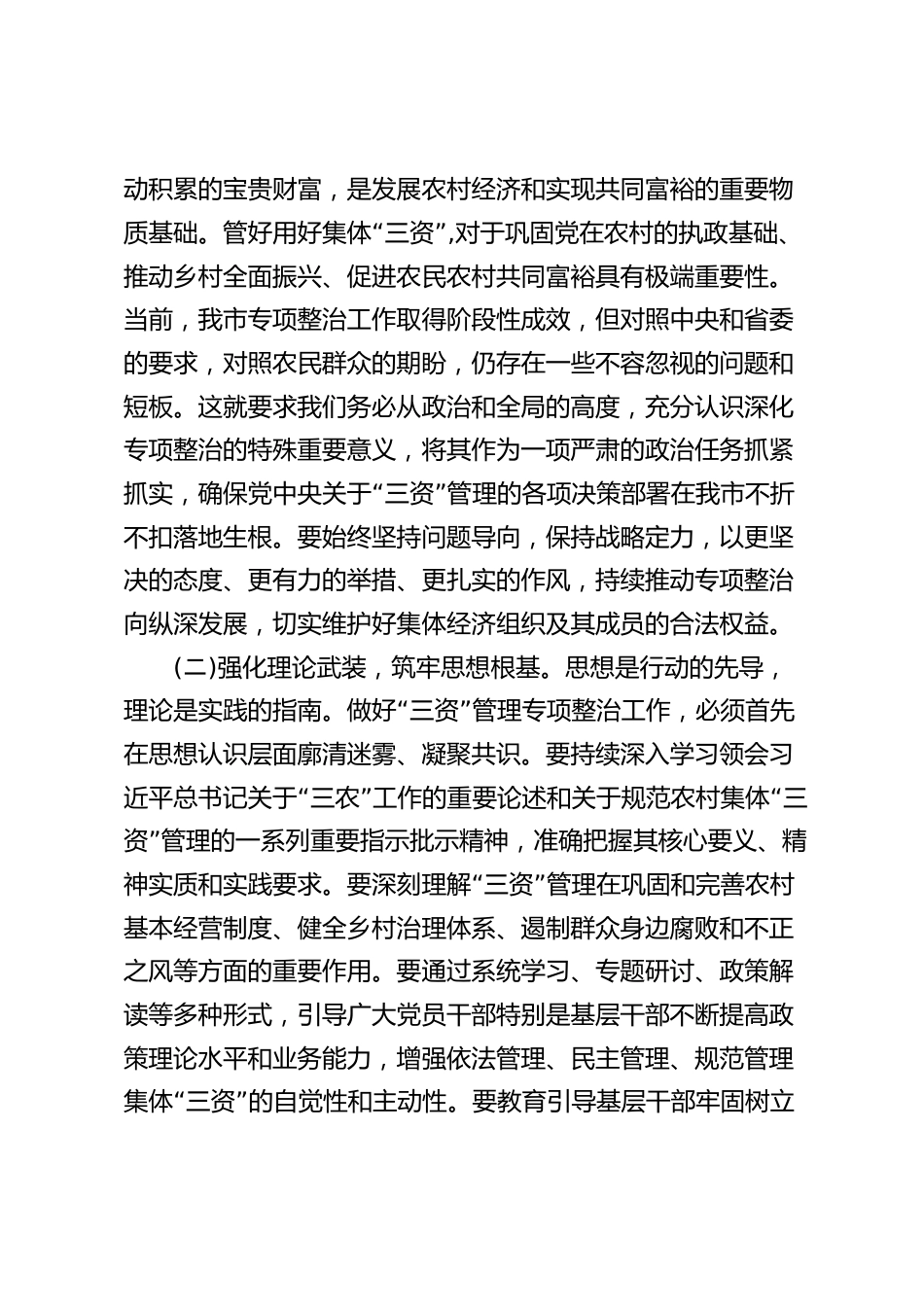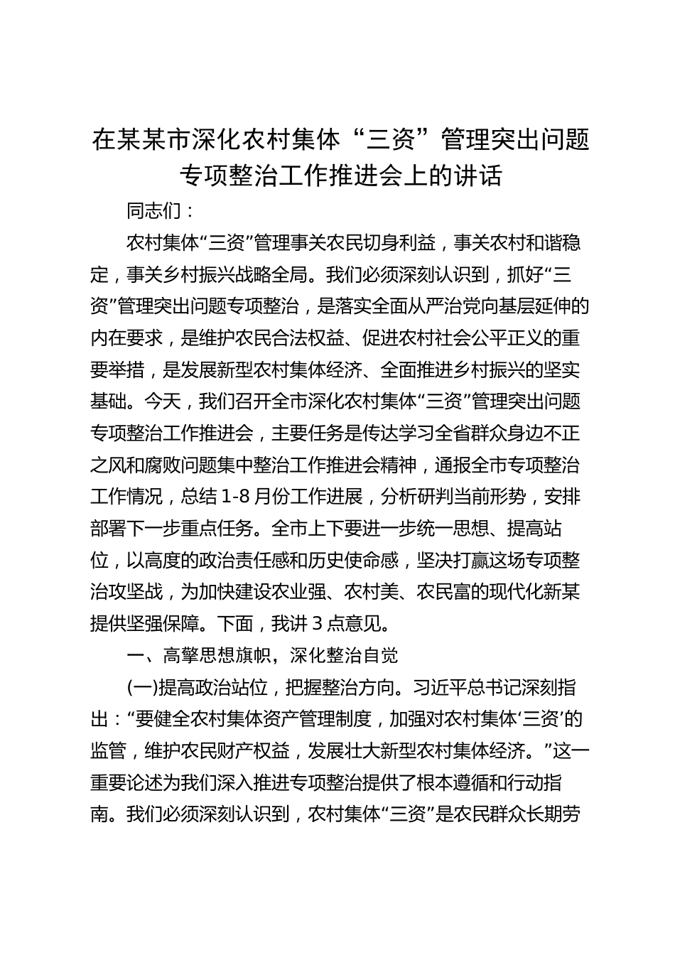 在某某市深化農(nóng)村集體“三資”管理突出問題專項整治工作推進會上的講話