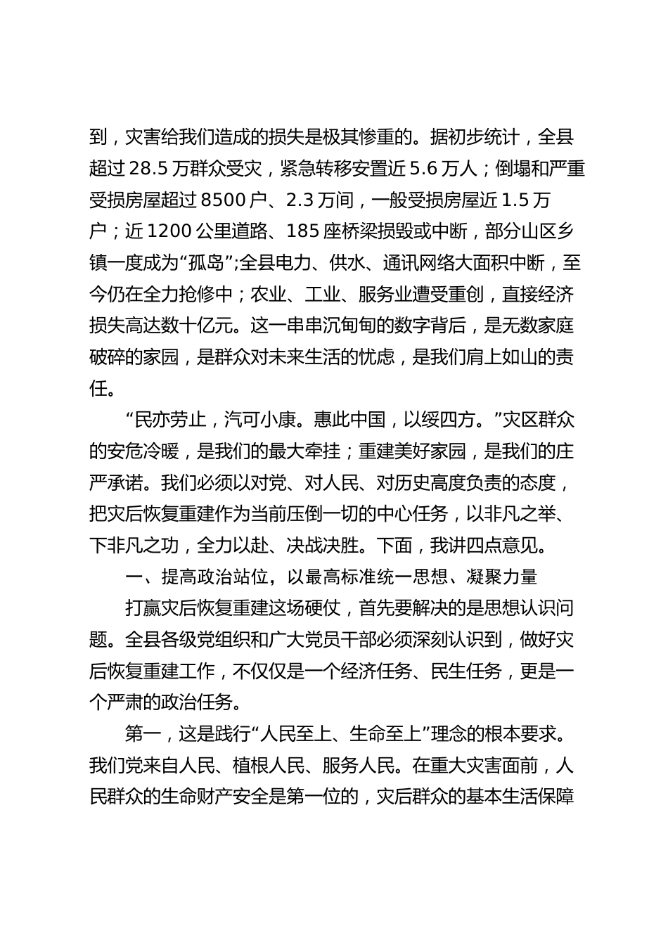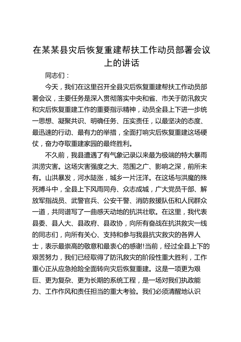 在某某縣災(zāi)后恢復(fù)重建幫扶工作動(dòng)員部署會(huì)議上的講話同志們:今天,我們在這里召開全縣災(zāi)后恢復(fù)重建幫扶工作動(dòng)員部署會(huì)議,主要任務(wù)是深入貫徹落實(shí)中央和省、市關(guān)于防汛救災(zāi)和災(zāi)后恢復(fù)重建工作的重要指示精神,動(dòng)員全縣上下進(jìn)一步統(tǒng)一思想、凝聚共識、明確任務(wù)、壓實(shí)責(zé)任,以最堅(jiān)決的態(tài)度、最迅速的行動(dòng)、最有力的舉措,全面打響災(zāi)后恢復(fù)重建這場硬仗,奮力奪取重建家園的最終勝利。不久前,我縣遭遇了有氣象記錄以來最為極端的特大暴雨洪澇災(zāi)害。這場災(zāi)害強(qiáng)度之大、范圍之廣、影響之深,前所未有。山洪暴發(fā),河水陡漲,城鄉(xiāng)一片汪洋。在這場與洪魔的殊死搏斗中,全縣上下...