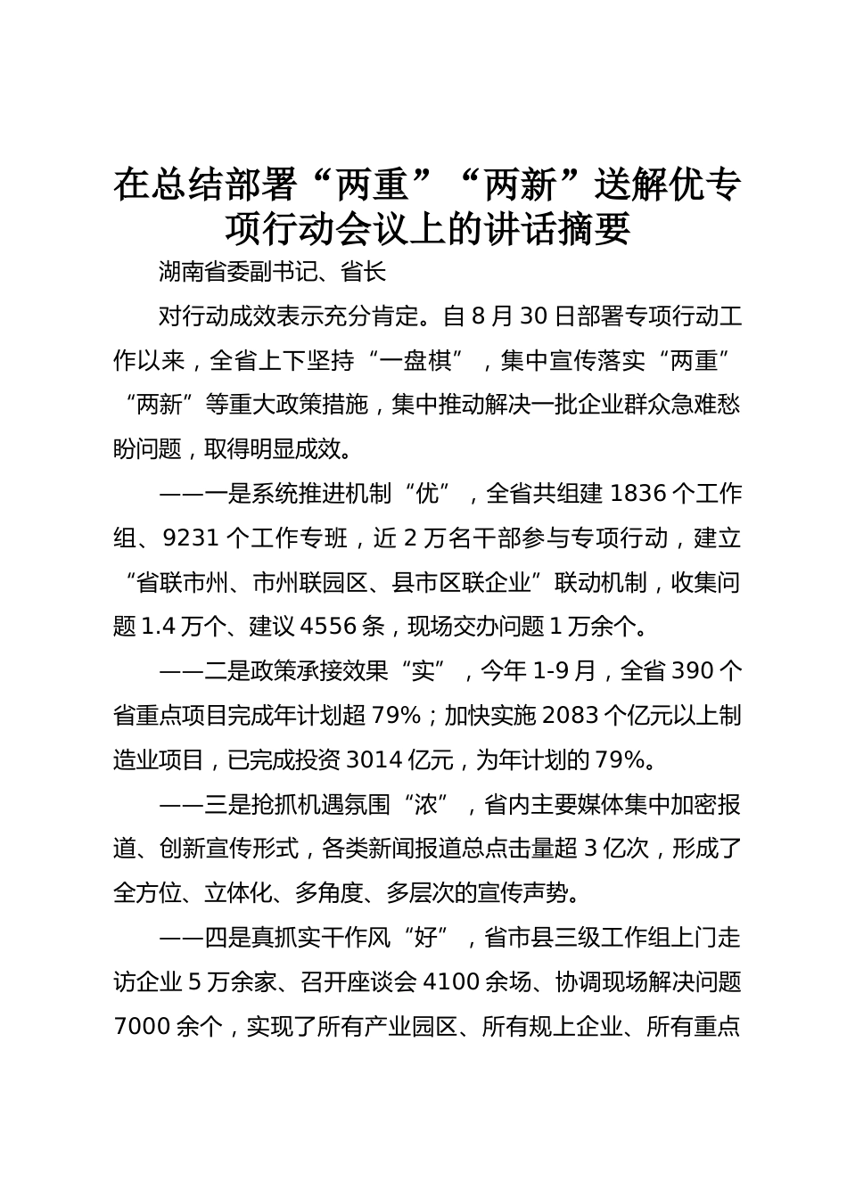 在總結(jié)部署“兩重”“兩新”送解優(yōu)專(zhuān)項(xiàng)行動(dòng)會(huì)議上的講話摘要湖南省委副書(shū)記、省長(zhǎng)對(duì)行動(dòng)成效表示充分肯定。自8月30日部署專(zhuān)項(xiàng)行動(dòng)工作以來(lái),全省上下堅(jiān)持“一盤(pán)棋”,集中宣傳落實(shí)“兩重”“兩新”等重大政策措施,集中推動(dòng)解決一批企業(yè)群眾急難愁盼問(wèn)題,取得明顯成效?!皇窍到y(tǒng)推進(jìn)機(jī)制“優(yōu)”,全省共組建1836個(gè)工作組、9231個(gè)工作專(zhuān)班,近2萬(wàn)名干部參與專(zhuān)項(xiàng)行動(dòng),建立“省聯(lián)市州、市州聯(lián)園區(qū)、縣市區(qū)聯(lián)企業(yè)”聯(lián)動(dòng)機(jī)制,收集問(wèn)題1.4萬(wàn)個(gè)、建議4556條,現(xiàn)場(chǎng)交辦問(wèn)題1萬(wàn)余個(gè)?!钦叱薪有Ч皩?shí)”,今年1-9月,全省390個(gè)省重點(diǎn)項(xiàng)目完成年計(jì)劃超79%;加快實(shí)施2...