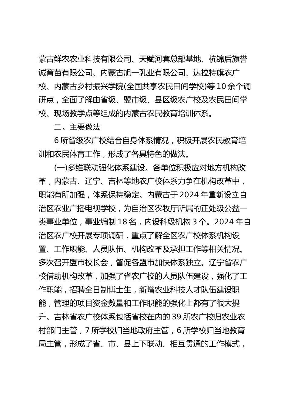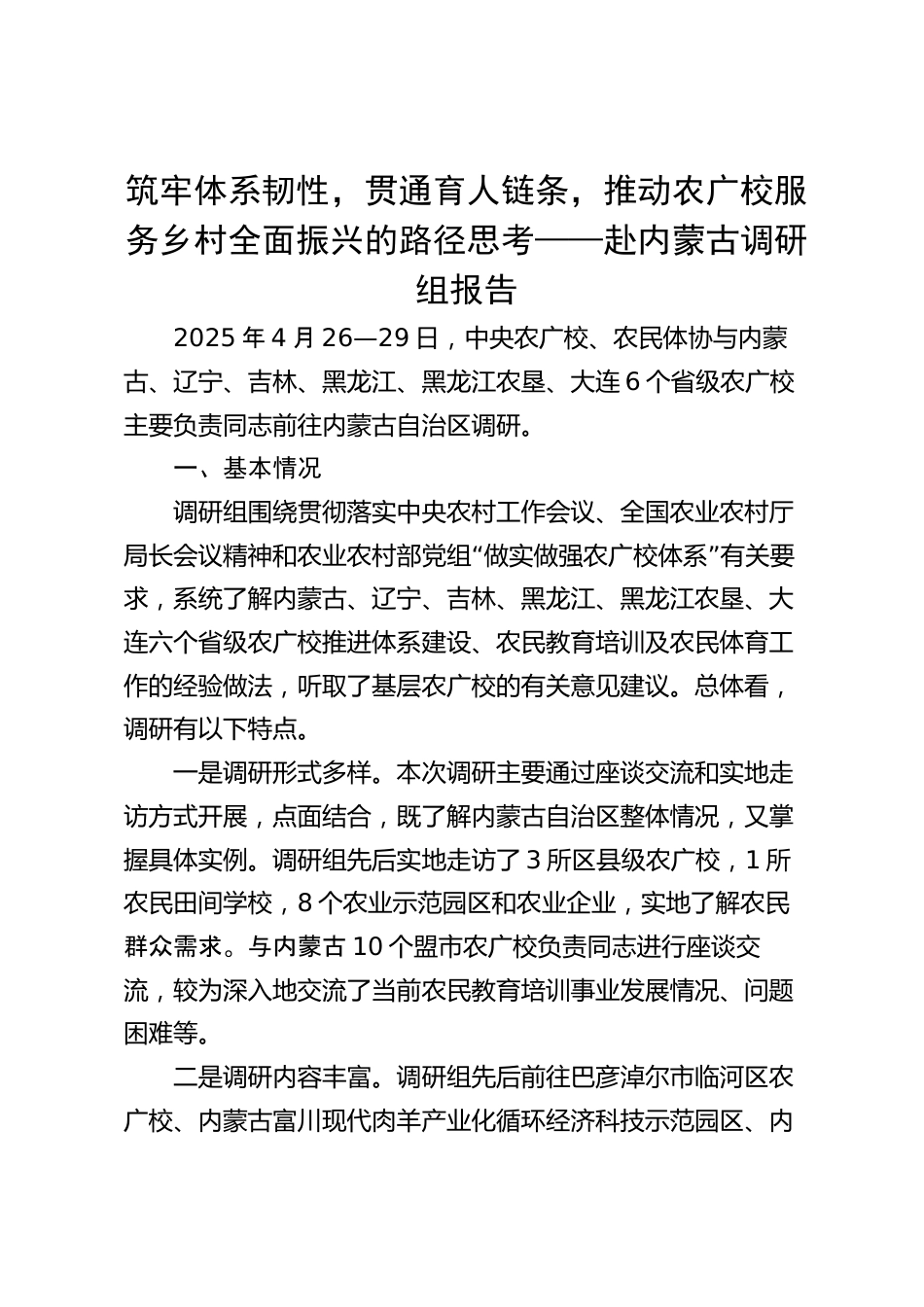 筑牢體系韌性,貫通育人鏈條,推動農(nóng)廣校服務(wù)鄉(xiāng)村全面振興的路徑思考——赴內(nèi)蒙古調(diào)研組報告2025年4月26—29日,中央農(nóng)廣校、農(nóng)民體協(xié)與內(nèi)蒙古、遼寧、吉林、黑龍江、黑龍江農(nóng)墾、大連6個省級農(nóng)廣校主要負責(zé)同志前往內(nèi)蒙古自治區(qū)調(diào)研。一、基本情況調(diào)研組圍繞貫徹落實中央農(nóng)村工作會議、全國農(nóng)業(yè)農(nóng)村廳“”局長會議精神和農(nóng)業(yè)農(nóng)村部黨組做實做強農(nóng)廣校體系有關(guān)要求,系統(tǒng)了解內(nèi)蒙古、遼寧、吉林、黑龍江、黑龍江農(nóng)墾、大連六個省級農(nóng)廣校推進體系建設(shè)、農(nóng)民教育培訓(xùn)及農(nóng)民體育工作的經(jīng)驗做法,聽取了基層農(nóng)廣校的有關(guān)意見建議。總體看,調(diào)研有以下特點。一是調(diào)研形式多樣...