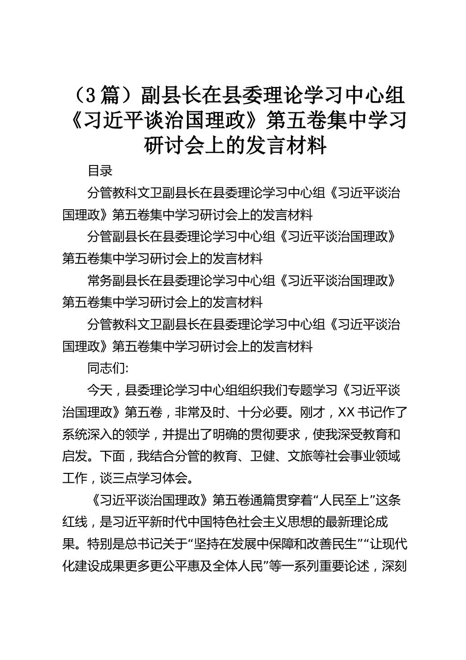 (3篇)副縣長(zhǎng)在縣委理論學(xué)習(xí)中心組《習(xí)近平談治國(guó)理政》第五卷集中學(xué)習(xí)研討會(huì)上的發(fā)言材料目錄分管教科文衛(wèi)副縣長(zhǎng)在縣委理論學(xué)習(xí)中心組《習(xí)近平談治國(guó)理政》第五卷集中學(xué)習(xí)研討會(huì)上的發(fā)言材料分管副縣長(zhǎng)在縣委理論學(xué)習(xí)中心組《習(xí)近平談治國(guó)理政》第五卷集中學(xué)習(xí)研討會(huì)上的發(fā)言材料常務(wù)副縣長(zhǎng)在縣委理論學(xué)習(xí)中心組《習(xí)近平談治國(guó)理政》第五卷集中學(xué)習(xí)研討會(huì)上的發(fā)言材料分管教科文衛(wèi)副縣長(zhǎng)在縣委理論學(xué)習(xí)中心組《習(xí)近平談治國(guó)理政》第五卷集中學(xué)習(xí)研討會(huì)上的發(fā)言材料同志們:今天,縣委理論學(xué)習(xí)中心組組織我們專題學(xué)習(xí)《習(xí)近平談治國(guó)理政》第五卷,非常及時(shí)、十分必要。剛...