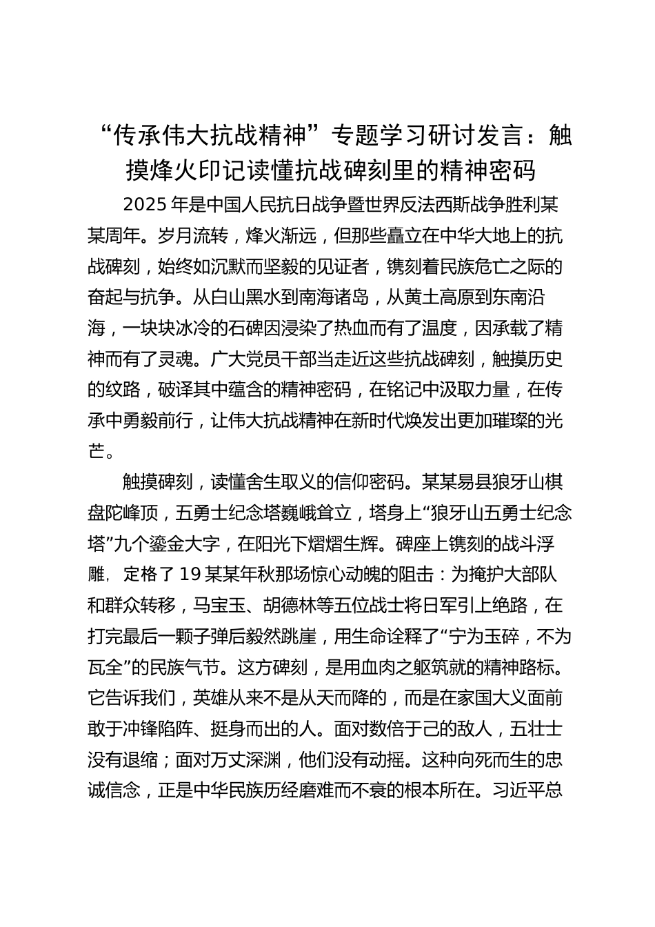 “傳承偉大抗戰(zhàn)精神”專題學(xué)習(xí)研討發(fā)言:觸摸烽火印記讀懂抗戰(zhàn)碑刻里的精神密碼2025年是中國人民抗日戰(zhàn)爭暨世界反法西斯戰(zhàn)爭勝利某某周年。歲月流轉(zhuǎn),烽火漸遠(yuǎn),但那些矗立在中華大地上的抗戰(zhàn)碑刻,始終如沉默而堅毅的見證者,鐫刻著民族危亡之際的奮起與抗?fàn)?。從白山黑水到南海諸島,從黃土高原到東南沿海,一塊塊冰冷的石碑因浸染了熱血而有了溫度,因承載了精神而有了靈魂。廣大黨員干部當(dāng)走近這些抗戰(zhàn)碑刻,觸摸歷史的紋路,破譯其中蘊(yùn)含的精神密碼,在銘記中汲取力量,在傳承中勇毅前行,讓偉大抗戰(zhàn)精神在新時代煥發(fā)出更加璀璨的光芒。觸摸碑刻,讀懂舍生取義的信仰...