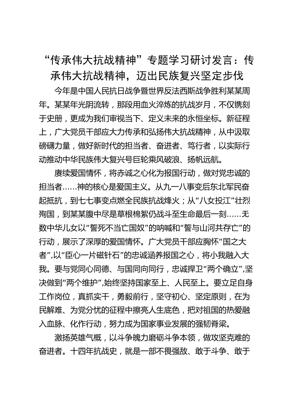 “傳承偉大抗戰(zhàn)精神”專題學習研討發(fā)言:傳承偉大抗戰(zhàn)精神,邁出民族復興堅定步伐