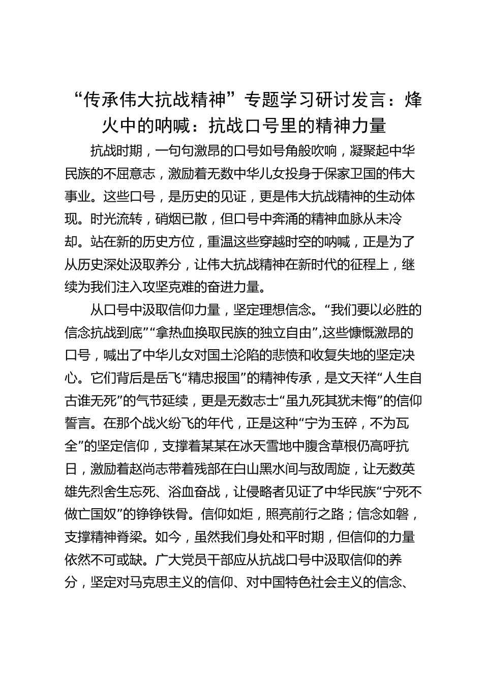 “傳承偉大抗戰(zhàn)精神”專題學(xué)習(xí)研討發(fā)言:烽火中的吶喊:抗戰(zhàn)口號(hào)里的精神力量